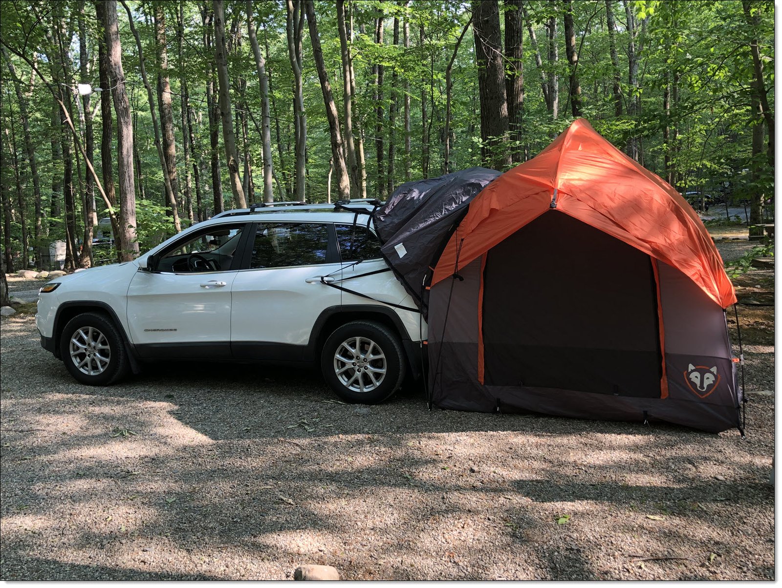 Car camping in the Hudson Valley region of New York state. Using a tent hooked to the back of the Jeep, with open tailgate, made for a comfortable camping arrangement. We slept in the Jeep on a thin air mattress, and used the tent for storage and dressing space. We just left the tent there when we went out driving around.