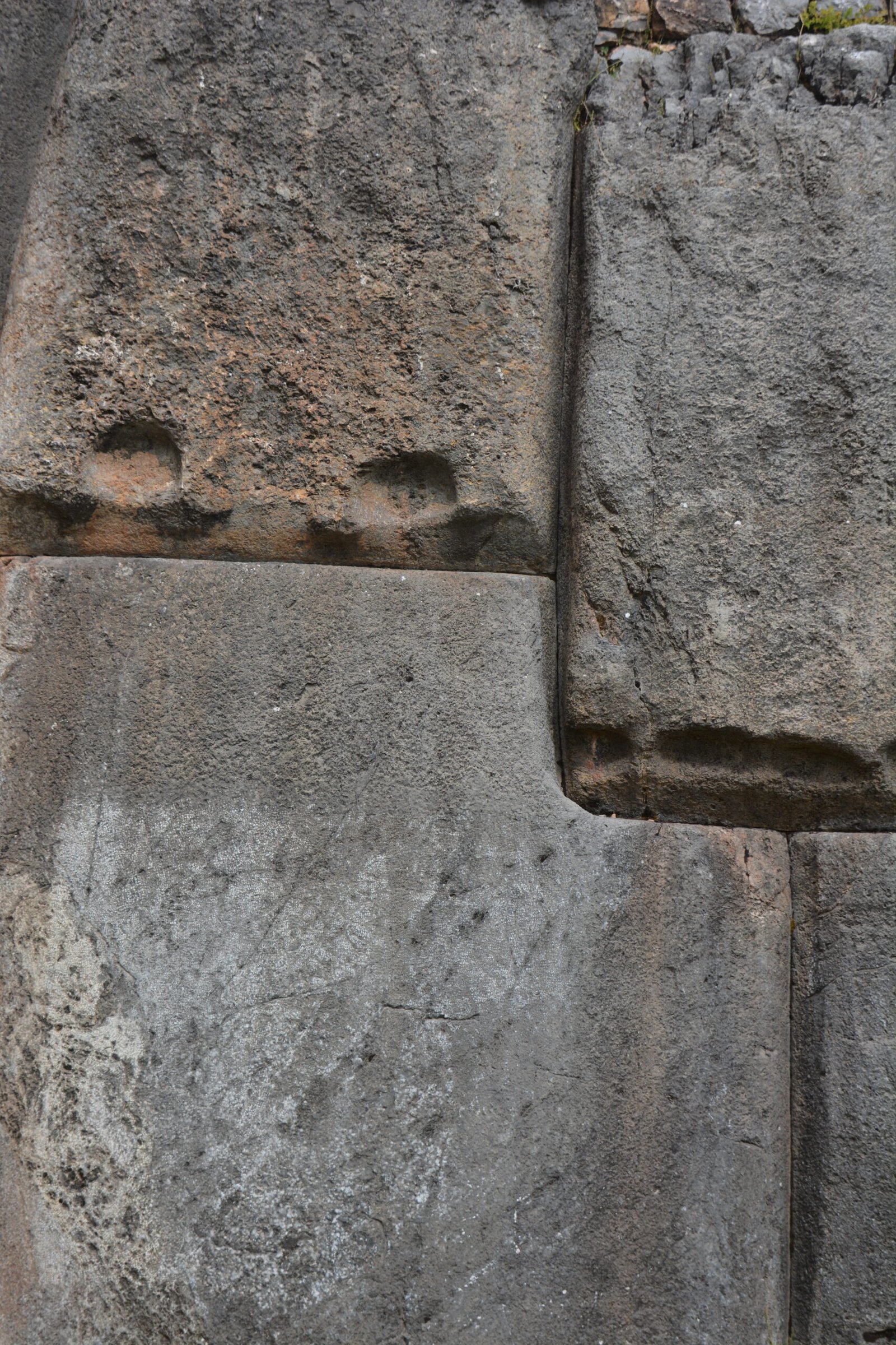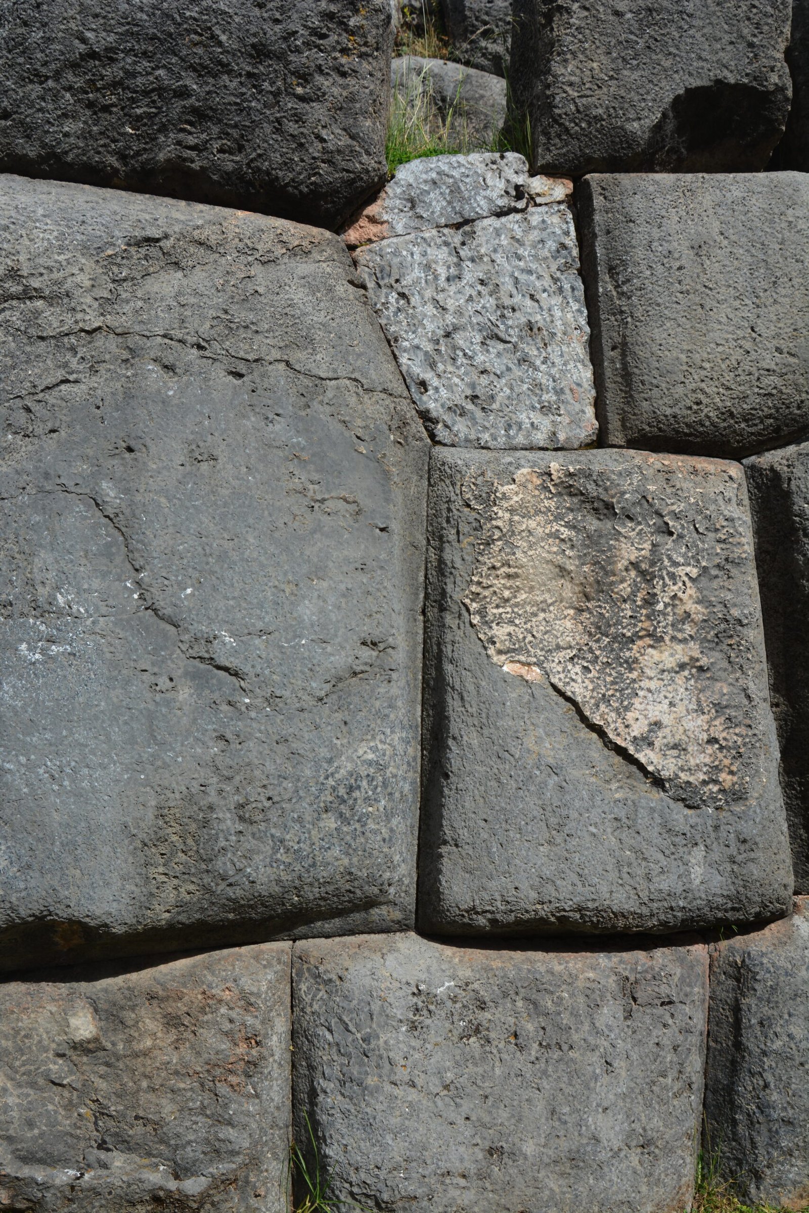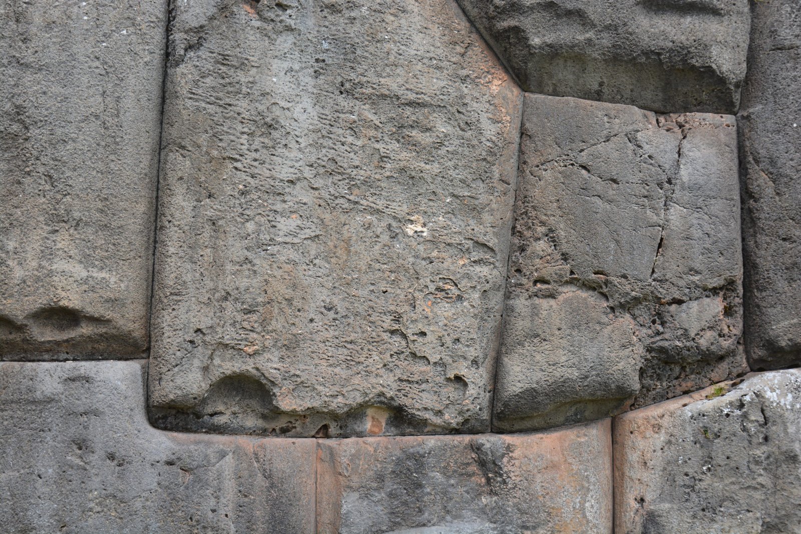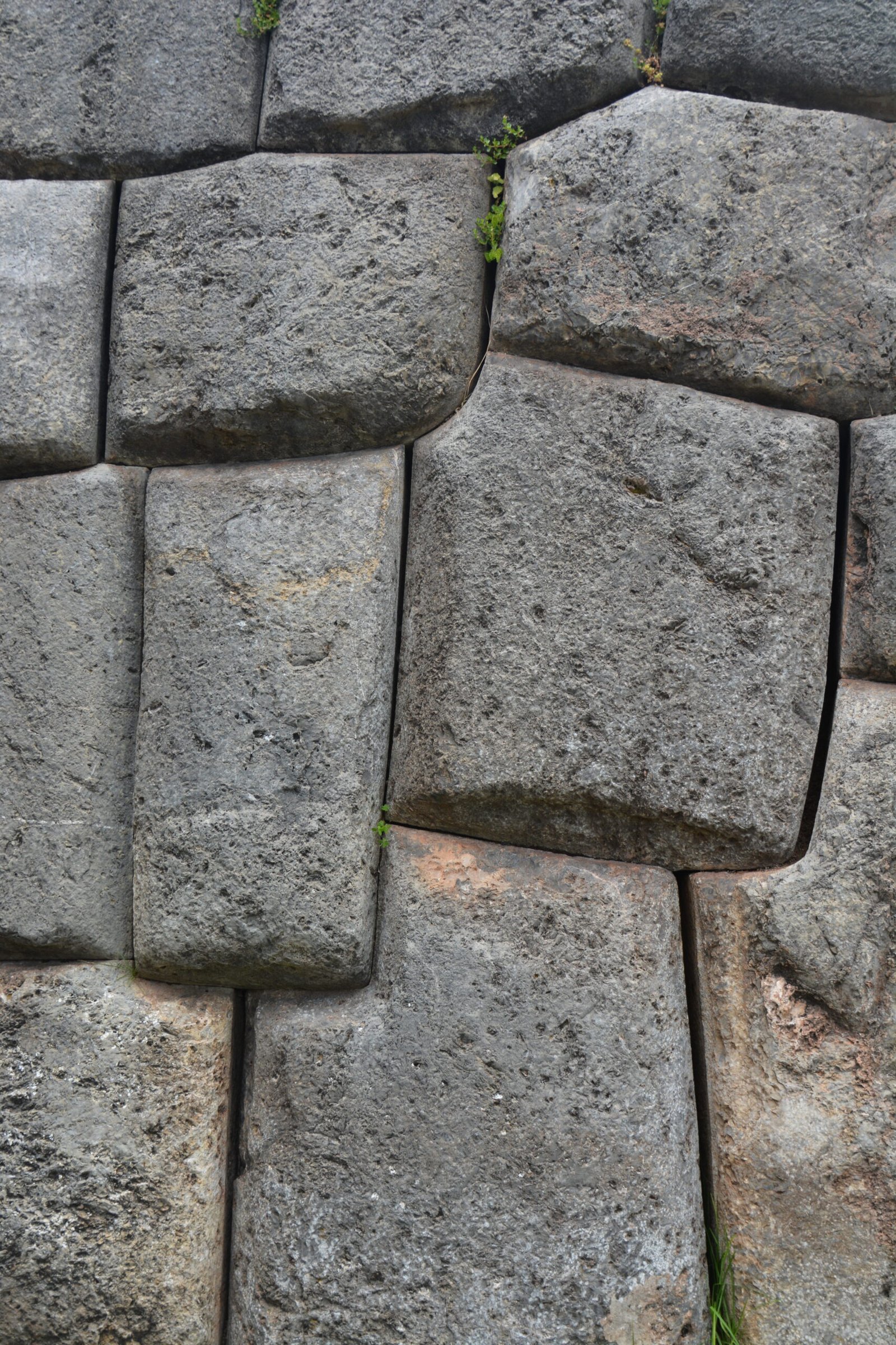 A detail view of cut and dressed stone in Sacsayhuaman, on the mountain overlooking Cusco. The larger of these stones were easily four feet tall.