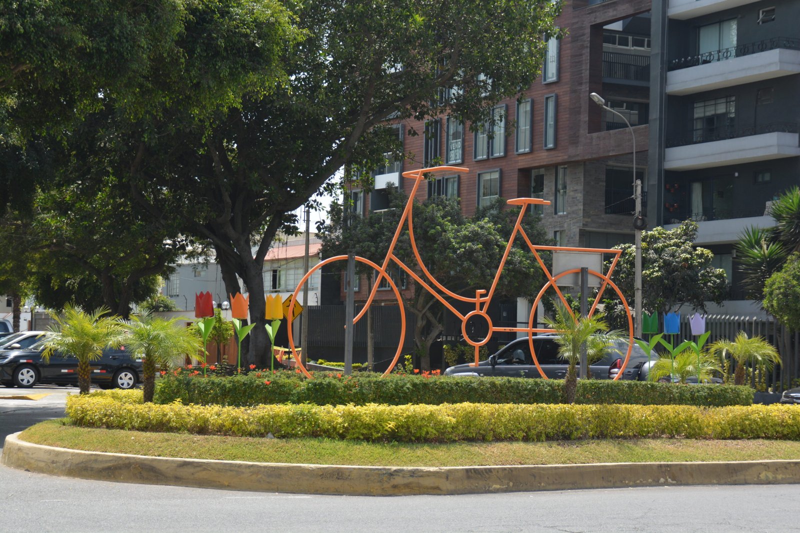 A colorful bicycle wireframe sculpture in the traffic circle of Óvalo de La Paz-Armendáriz, Miraflores