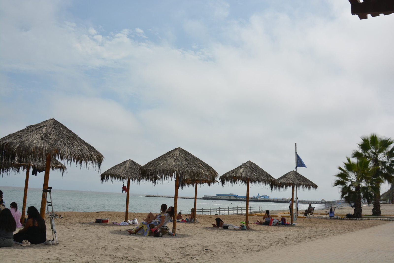 The Playa Redondo I , a sand and gravel beach with Tiki umbrellas, in the Miraflores District. The beach offered surfing and other water activities.