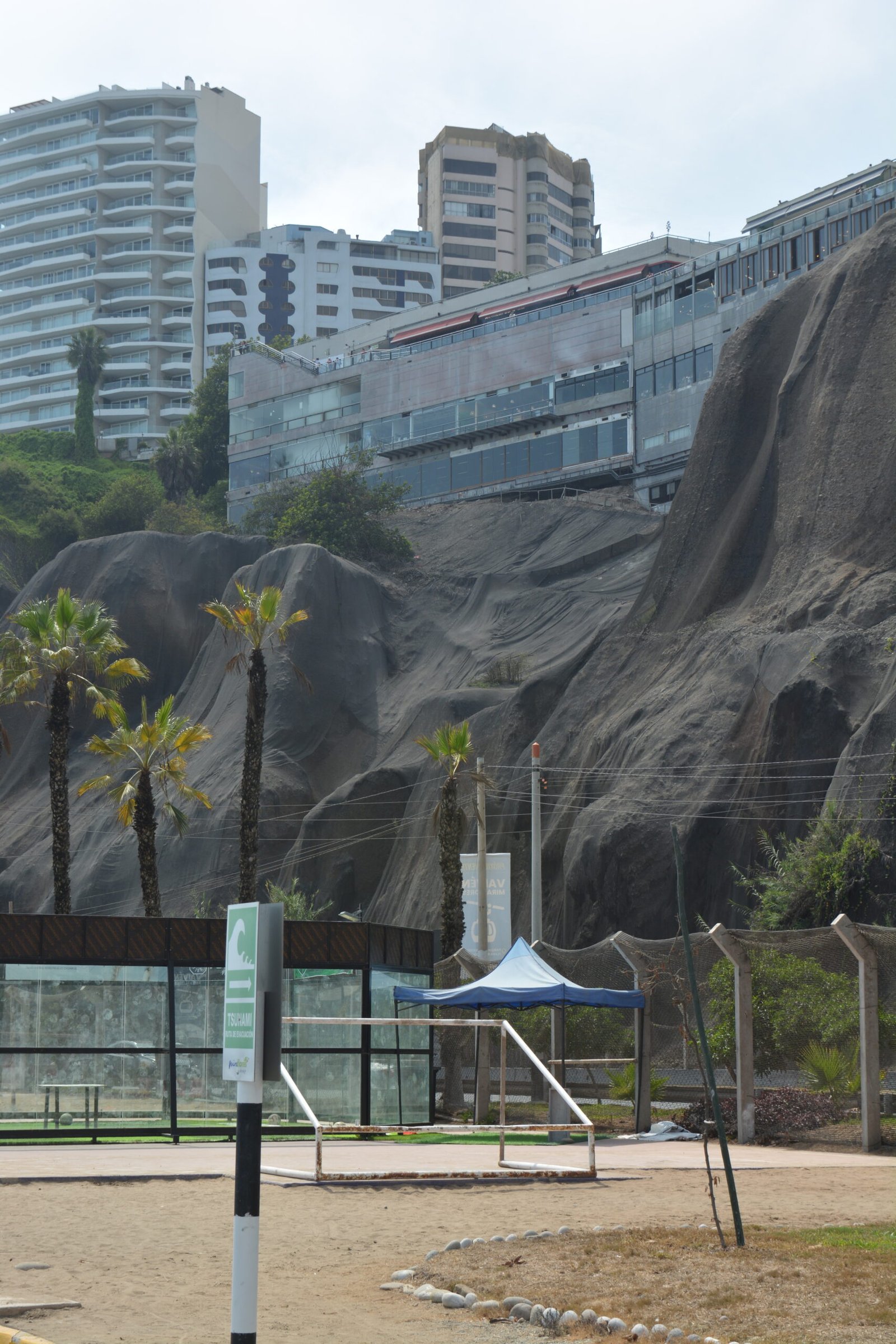 Looking up the coastal cliffs from the beach with the shopping mall of Parque Salazar at the top.