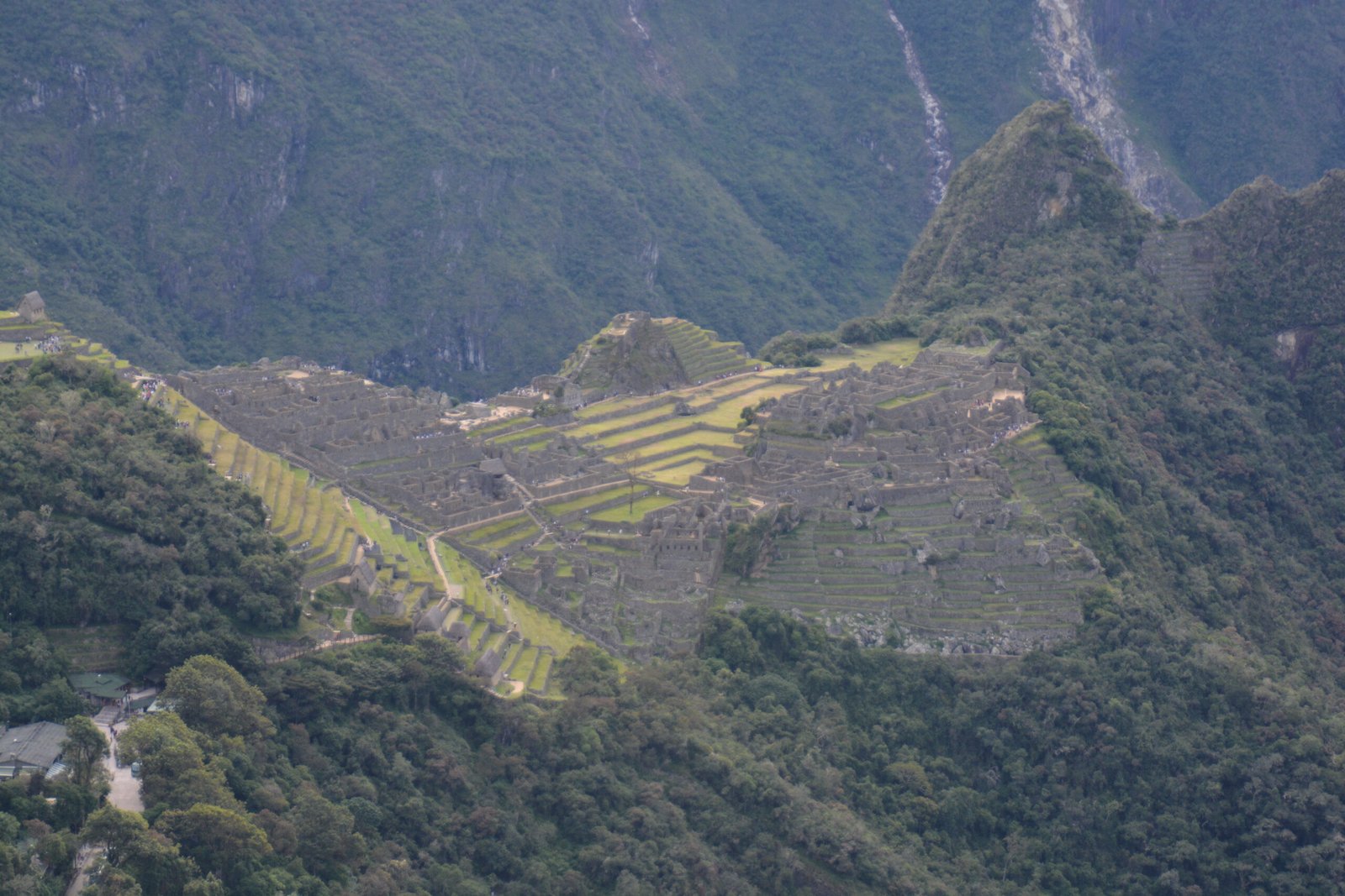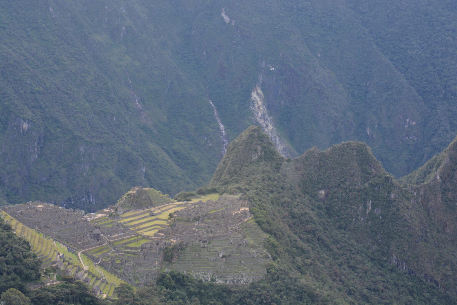 Showing a mix of buildings and farming terraces of Machu Picchu. This also shows some of the "catwalks" (protected walkways) created by the government to control and direct visitors. to this site. One item I found interesting was that these walkways have perforated plastic "floors" that allow grass to grow through them, but prevent ruts being worn from constant foot traffic.
