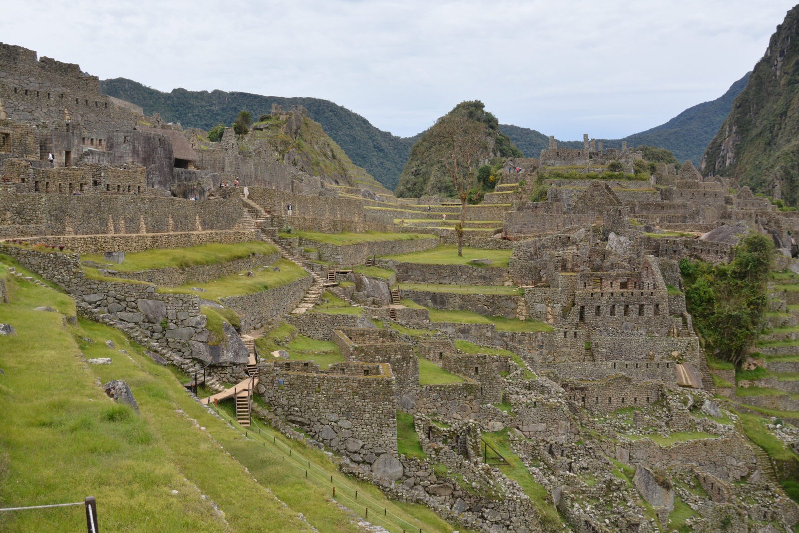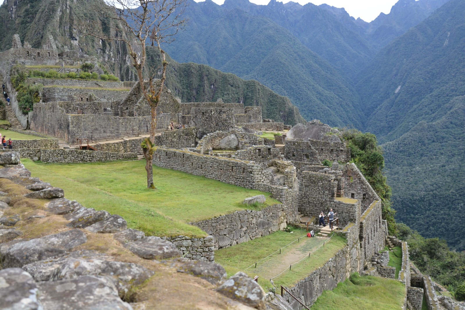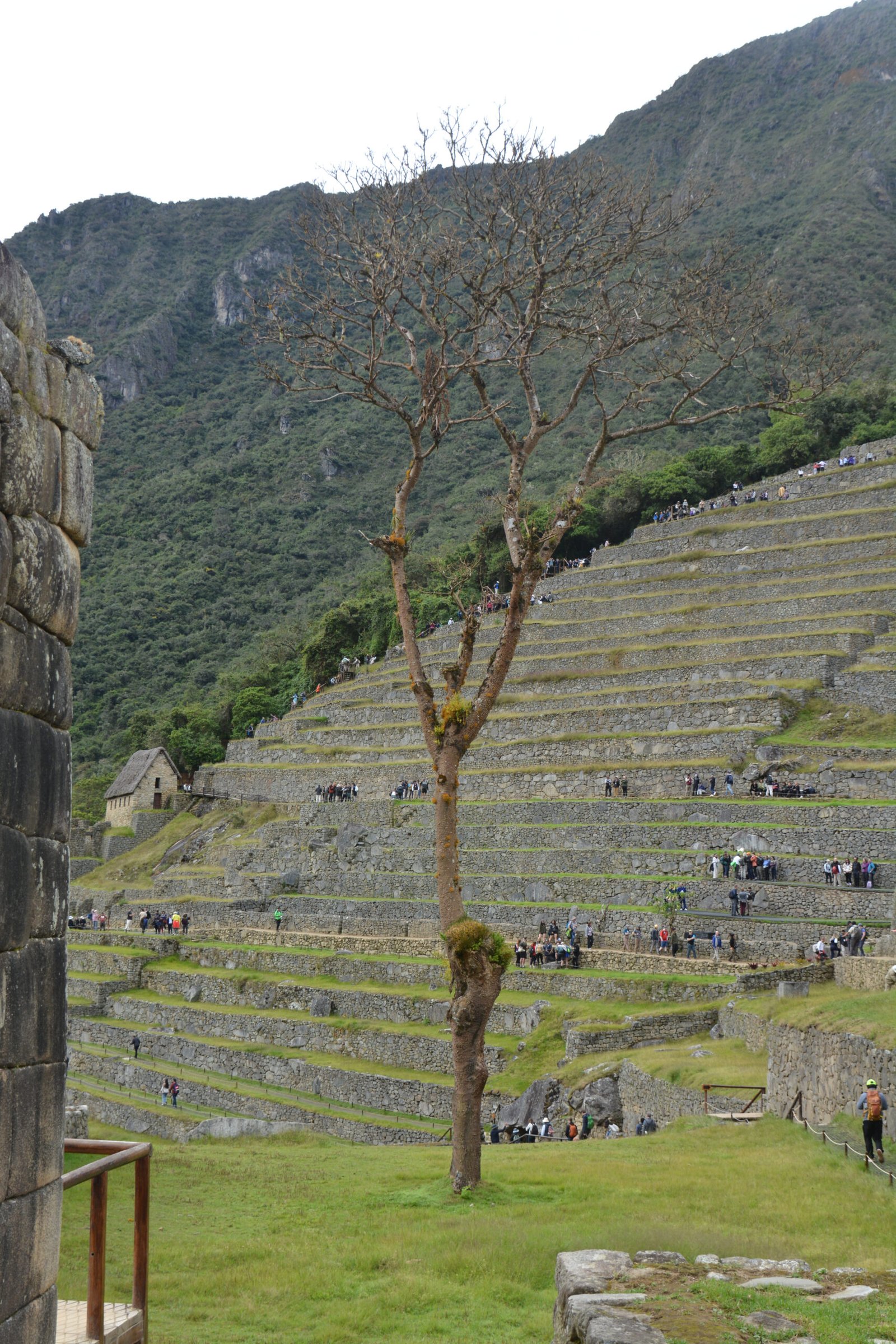 A courtyard in what was once a residential area of Machu Picchu. The tree was planted in 1979 and now has gained protected status as one of the living icons of Machu Picchu.
