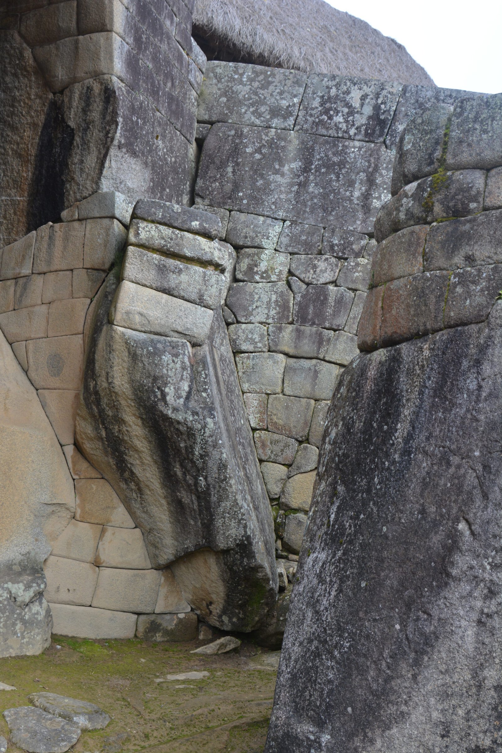 The Incas used natural stone formations as part of their constructions. This wall combines a natural stone formation with shaped stone to create a wall of a building.