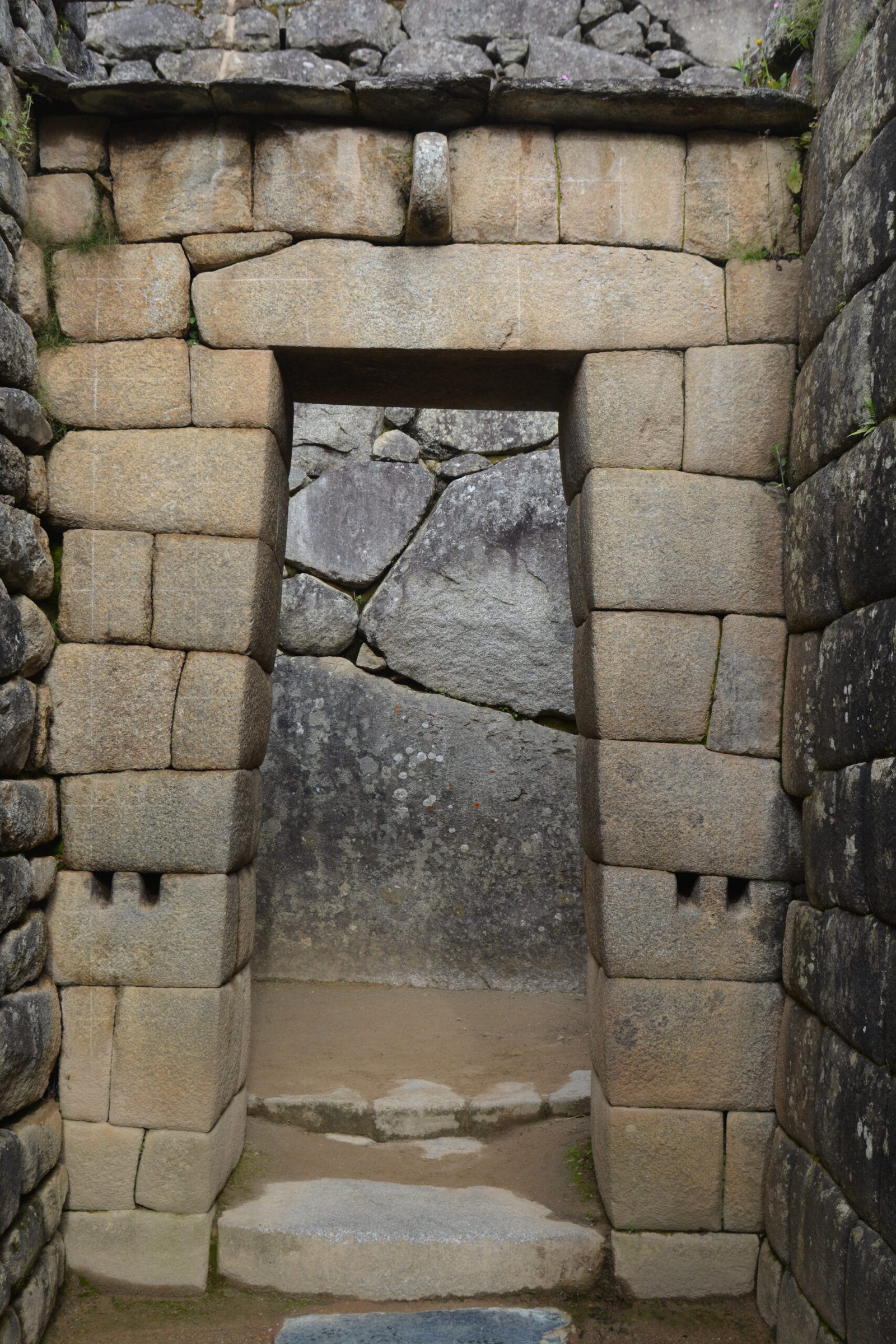 An example of a typical Incan doorway, seen throughout many archeological sites. The type of stone construction indicates this building was for high-ranking government or religious people. The two holes on either side were once used to tie a rope across the door. The Incas had no hinged doors in their structures. If they wanted privacy, they would tie a rope across the doorway opening.