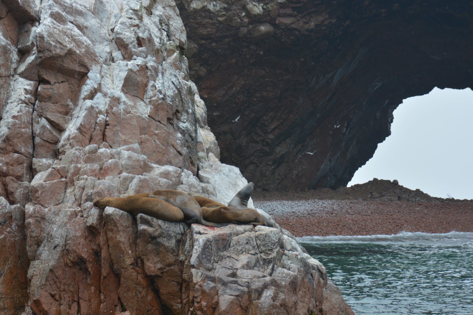 A small colony of sea lions sunbathing on the rocks of the Ballestas Islands. These islands are an important sanctuary for marine life such as the Humboldt penguin, cormorants, Peruvian booby, Peruvian pelican, the Inca tern, and two types of seals.