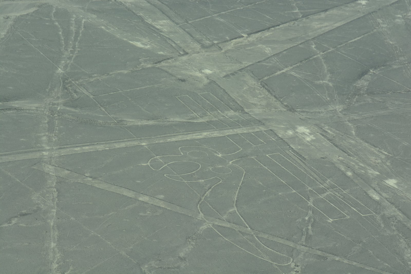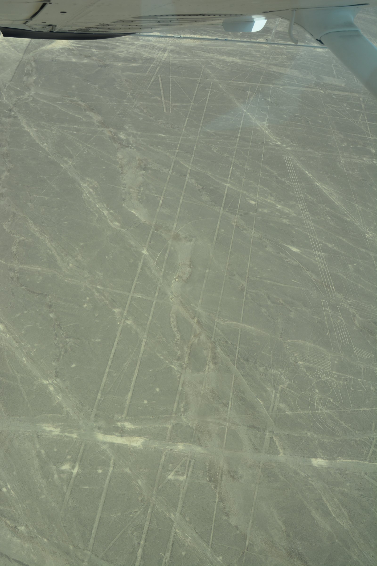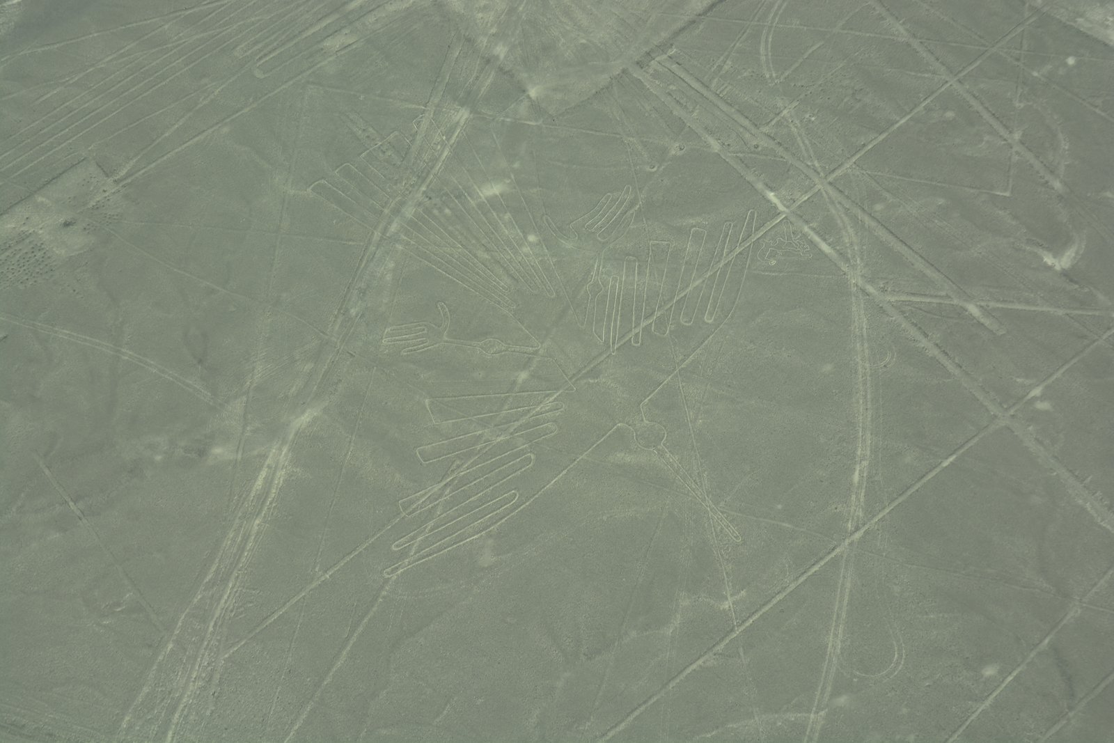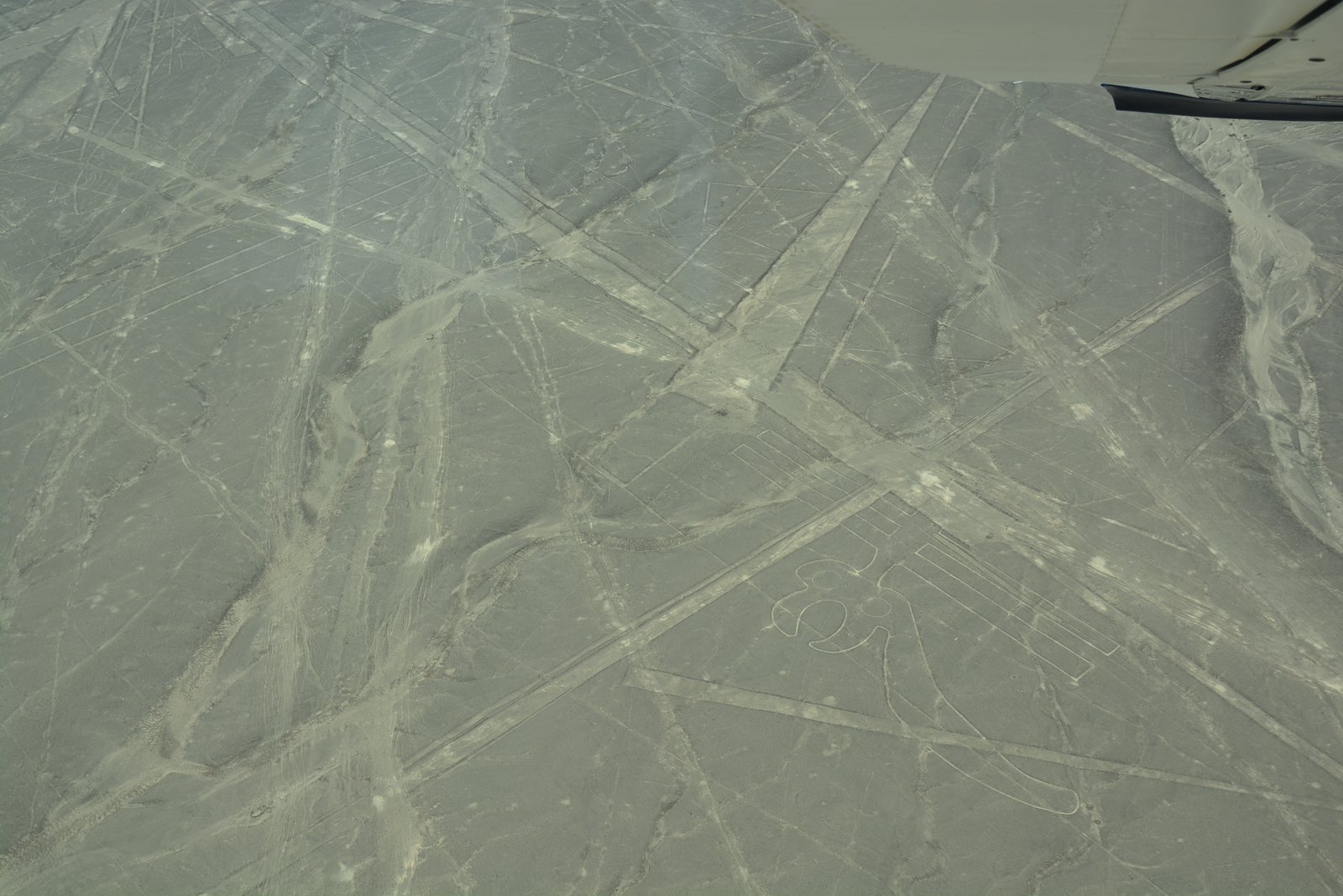 Our flight was at about 11:30AM, so the sun was high and reduced the contrast of the lines. The lines themselves were created by digging several inches into the desert sands which uncovered lighter-colored soils than on the surface. As there has been almost no significant rainfall over the past several thousand years, these lines have been mostly well preserved. At present, researchers have identified over 700 images in this region, and are continuing to discover more using satellite imaging and computer enhancements.