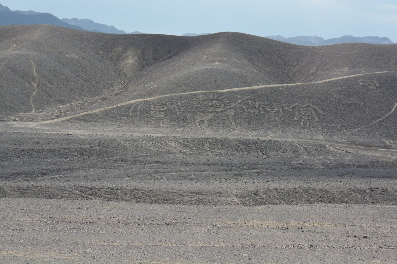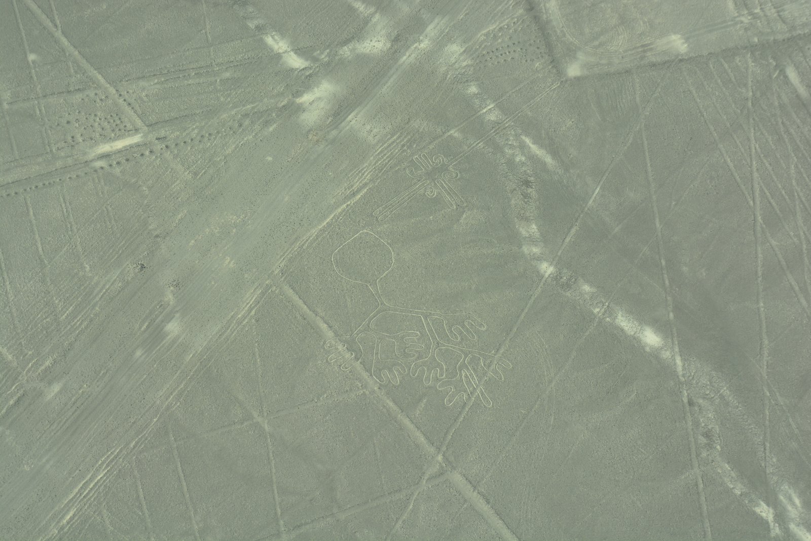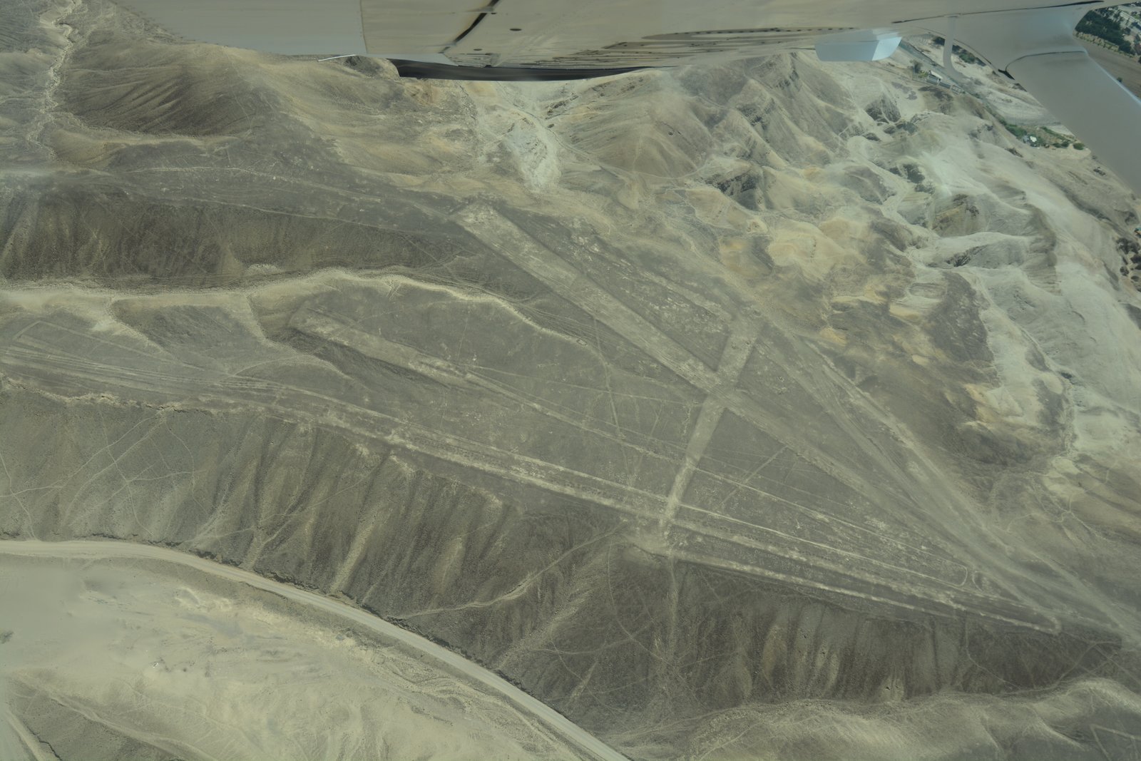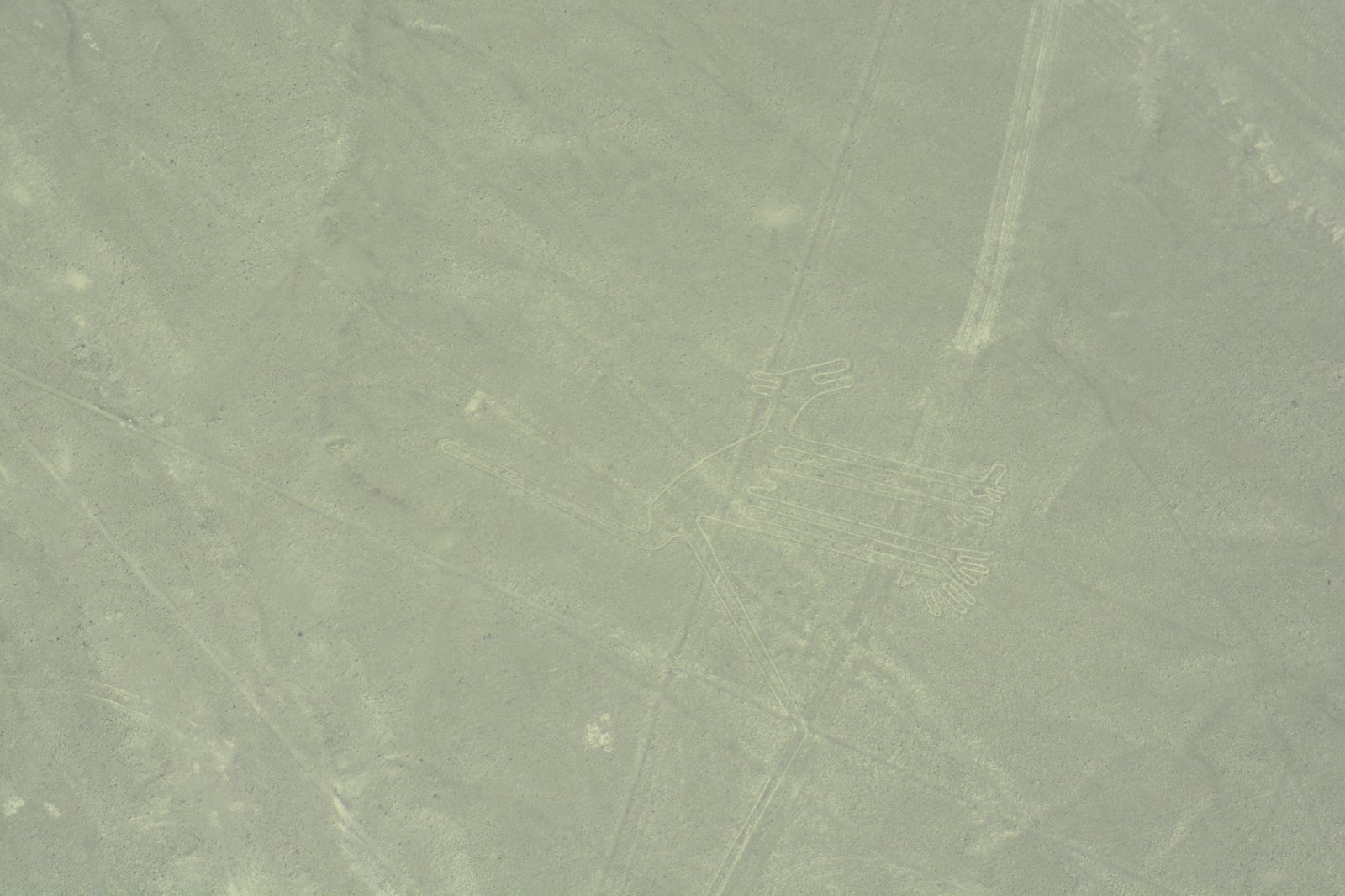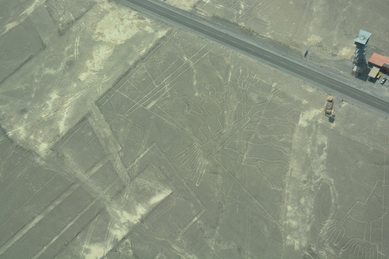 Our flight was at about 11:30AM, so the sun was high and reduced the contrast of the lines. The lines themselves were created by digging several inches into the desert sands which uncovered lighter-colored soils than on the surface. As there has been almost no significant rainfall over the past several thousand years, these lines have been mostly well preserved. At present, researchers have identified over 700 images in this region, and are continuing to discover more using satellite imaging and computer enhancements.