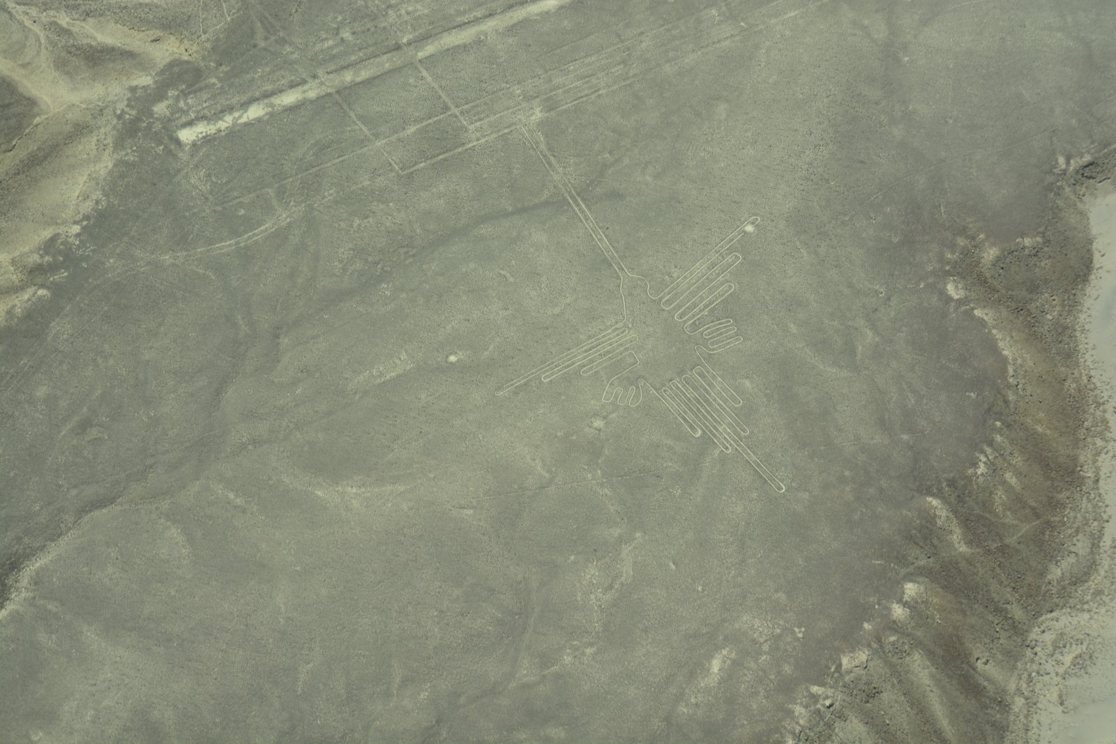 A hummingbird and straight lines. Part of over 700 geoglyphs made in the soil of the Nazca Desert in southern Peru. These lines were created between 500BC and 500AD by people making depressions or shallow incisions in the desert floor, removing pebbles and leaving different-colored dirt exposed.