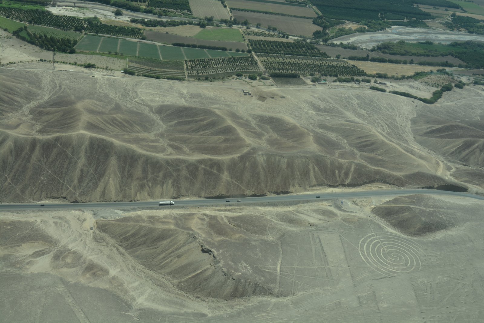 The Spiral and straight lines. Part of over 700 geoglyphs made in the soil of the Nazca Desert in southern Peru. These lines were created between 500BC and 500AD by people making depressions or shallow incisions in the desert floor, removing pebbles and leaving different-colored dirt exposed. The highway running through the desert is the Pan-American Highway, part of a network of roads running from northern Alaska all the way down North America, Central and South America down to Ushuaia, Argentina.