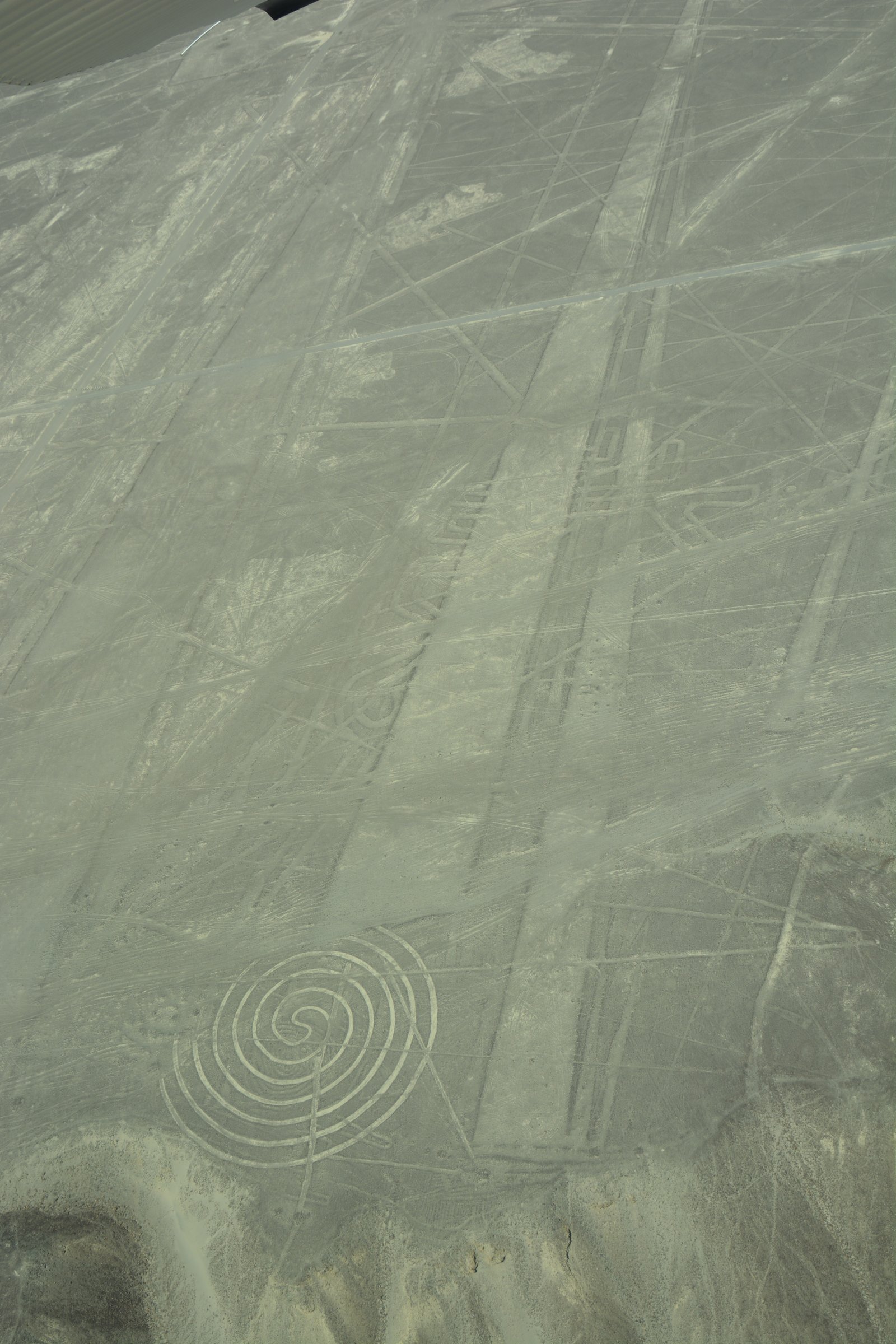 The Spiral and straight lines. Part of over 700 geoglyphs made in the soil of the Nazca Desert in southern Peru. These lines were created between 500BC and 500AD by people making depressions or shallow incisions in the desert floor, removing pebbles and leaving different-colored dirt exposed.