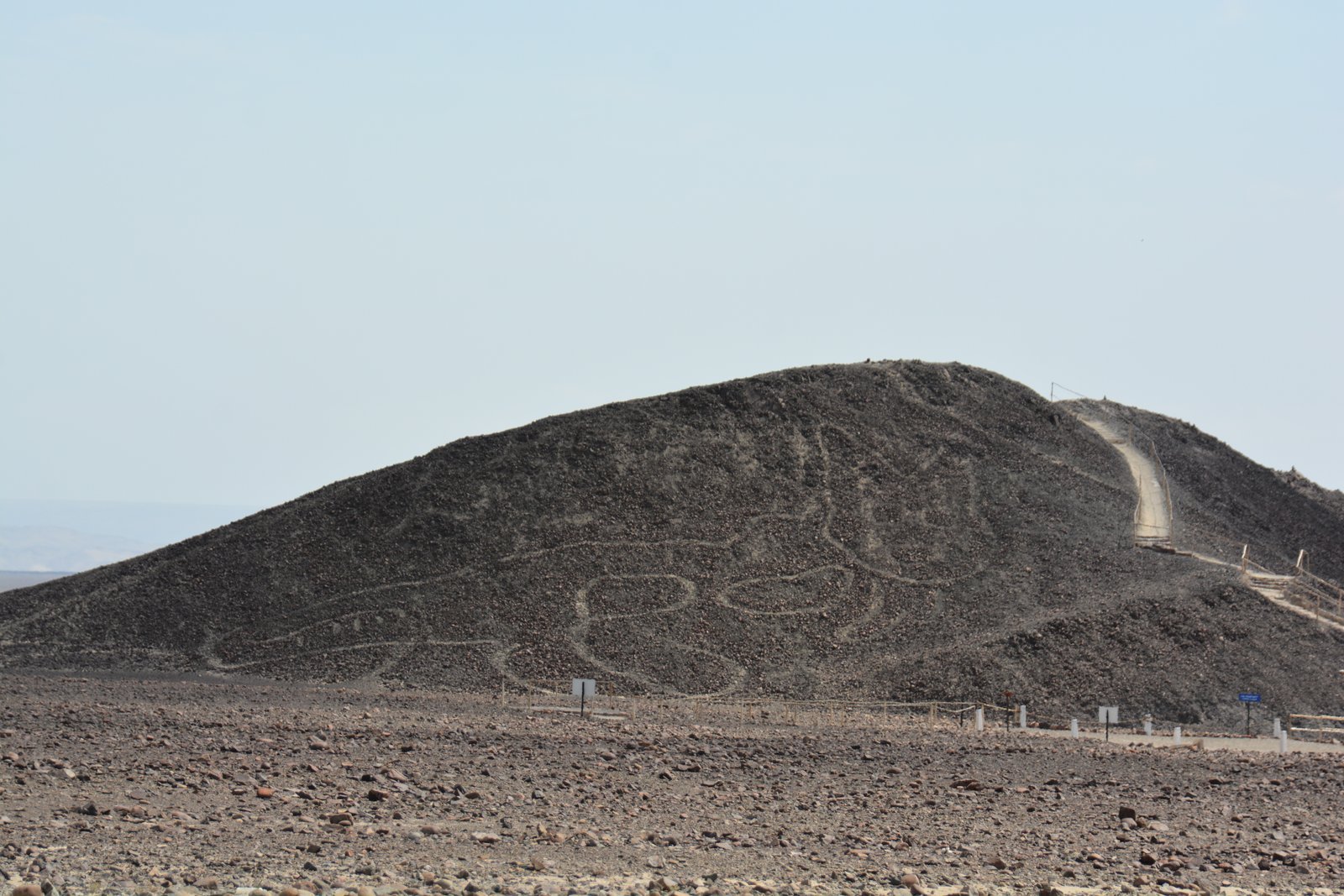 The Paracas Culture pre-date the Nazca culture and located to the north of Nazca. The Paracas built their images (geoglyphs) using stones instead of digging trenches. This geoglyph is a image of a cat.