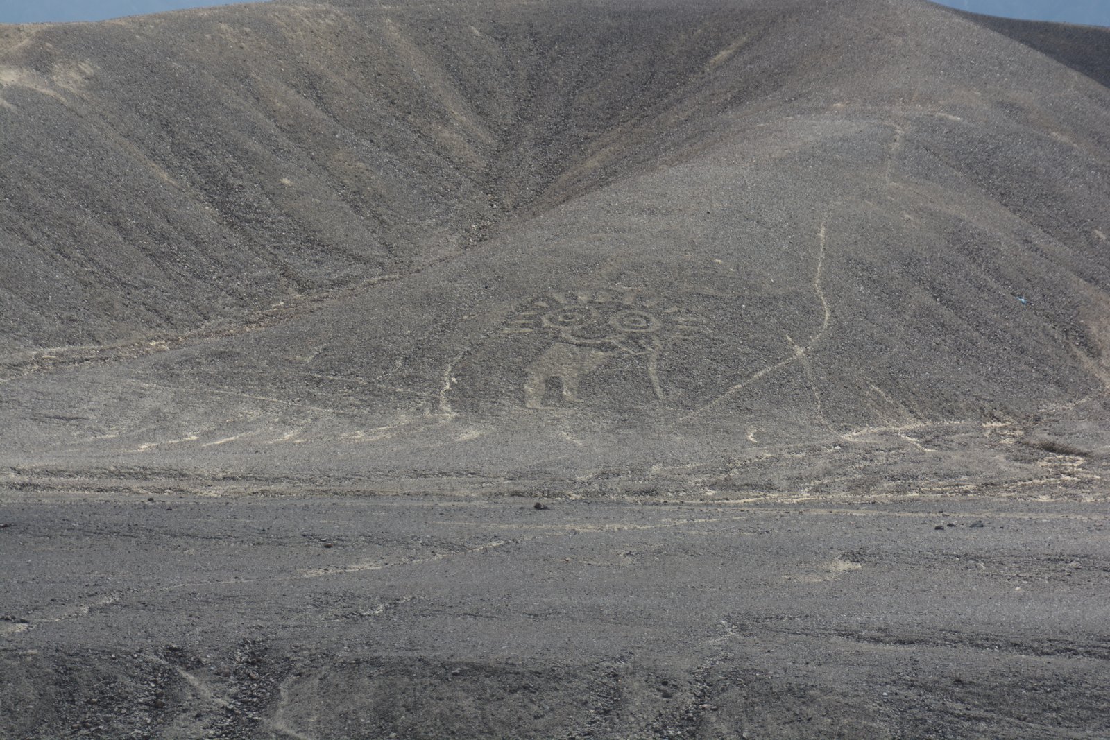 The Paracas Culture pre-date the Nazca culture and located to the north of Nazca. The Paracas built their images (geoglyphs) using stones instead of digging trenches. This geoglyph is a person, possibly a warrior or God. Some of these images predate the associated Nazca lines by over 1000 years.