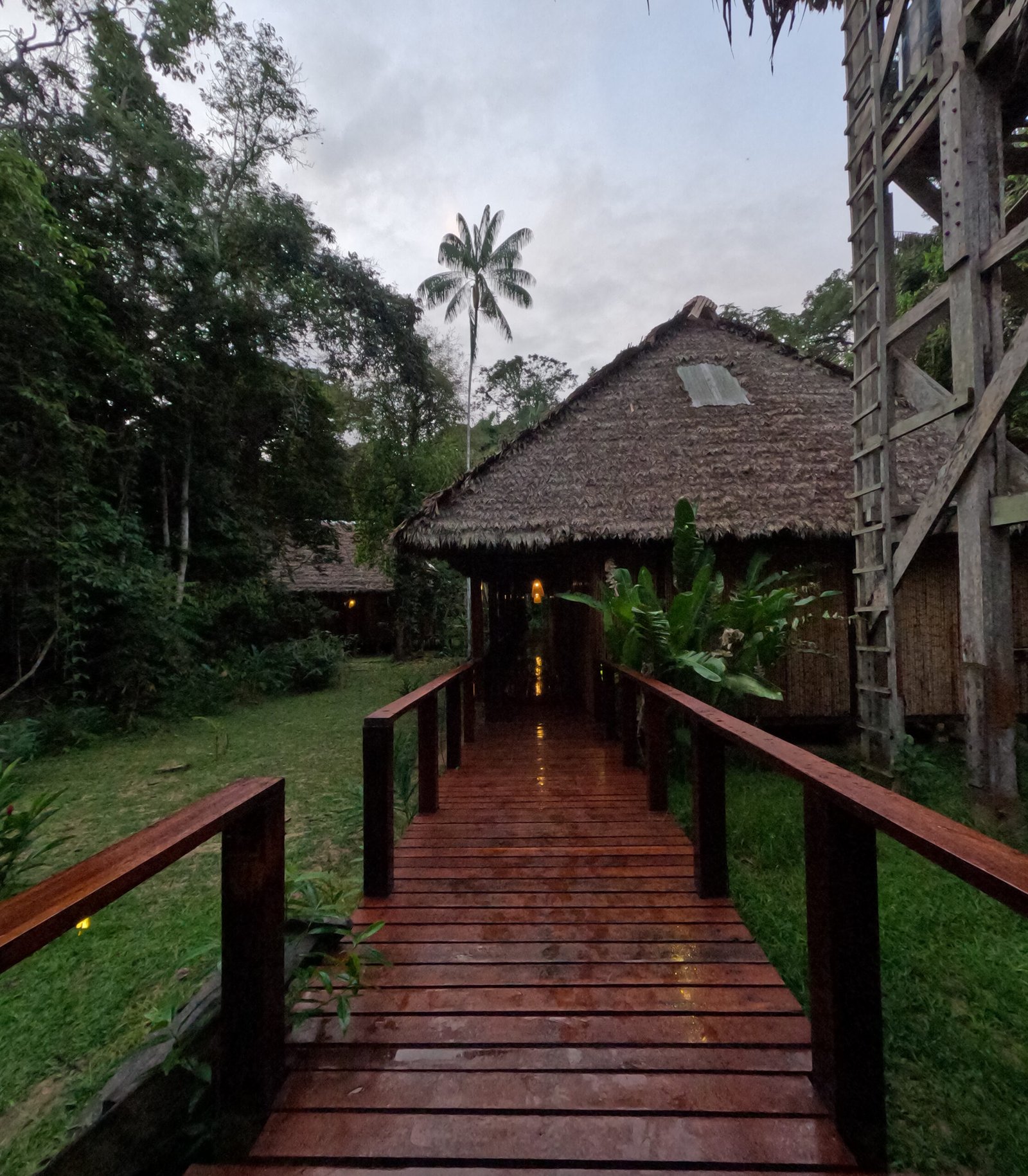 The Posada Amazonas Jungle Lodge is a collection of buildings connected by open walkways. This is the main entrance and lobby, accessed by a graveled trail from the river landing. There are no roads connecting this lodge with the outside world. All transport is via boats on the Tambopata River