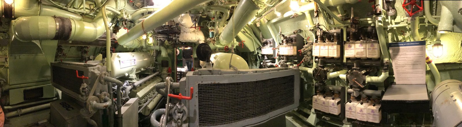A panoramic view of the engine room of the Wilhelm Bauer.