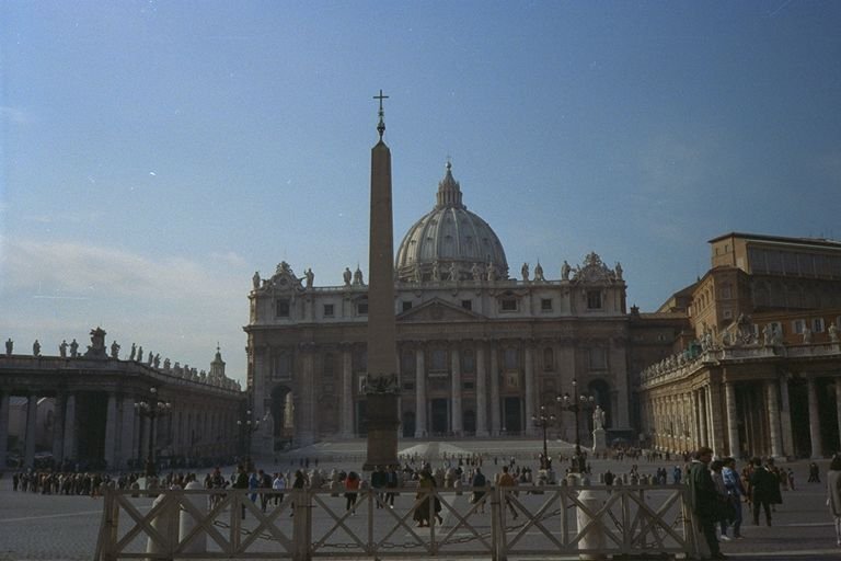 Looking at St. Peter's Basilica across St. Peter's Square, the main public plaza of the independent city-state of the Vatican.