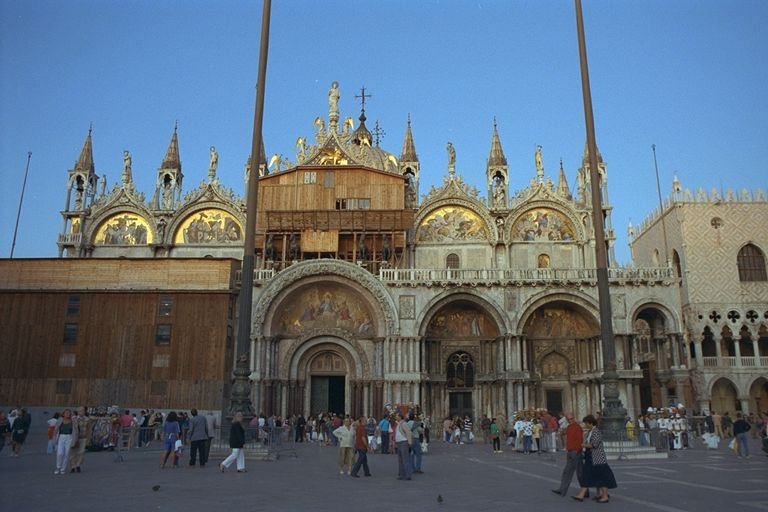The exterior of Saint Mark's Basilica in Venice, located in the heart of Piazza San Marco.