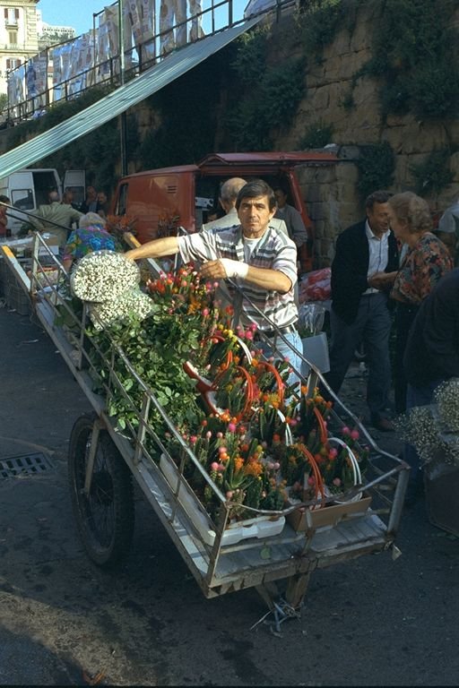 A street vendor in the central old-town area of Naples, selling his flowers and fruits.