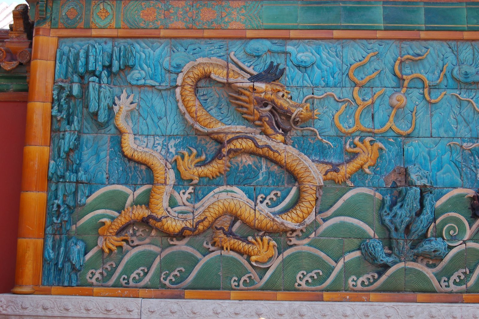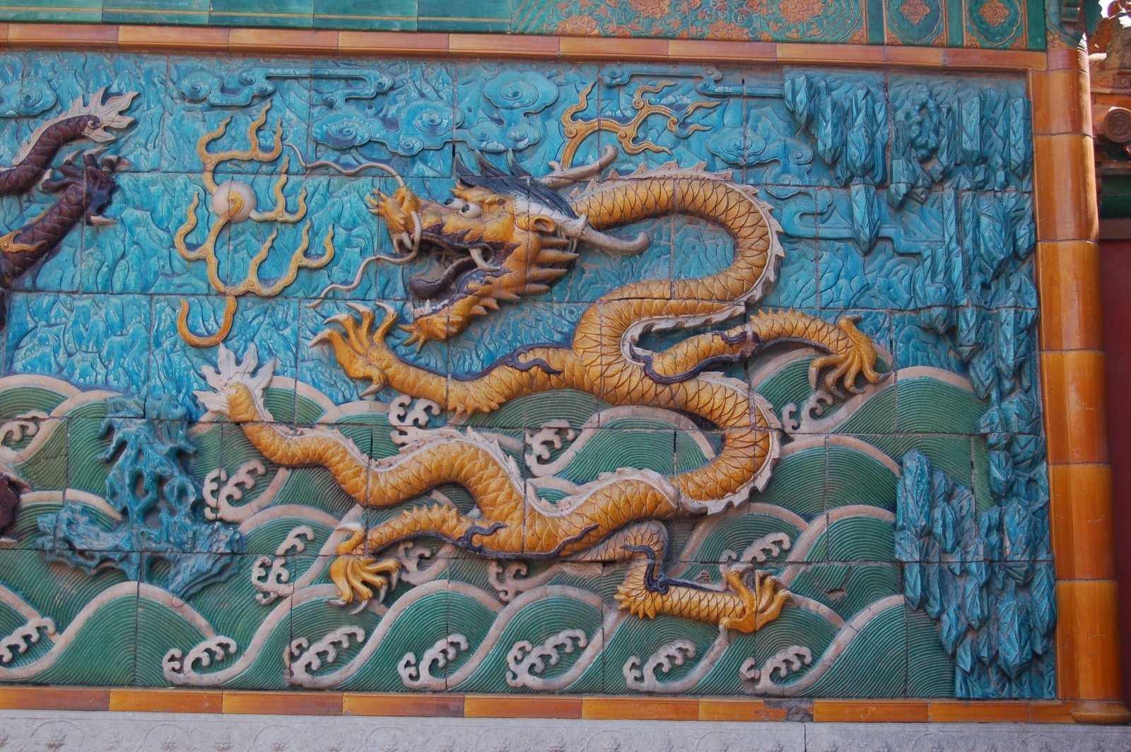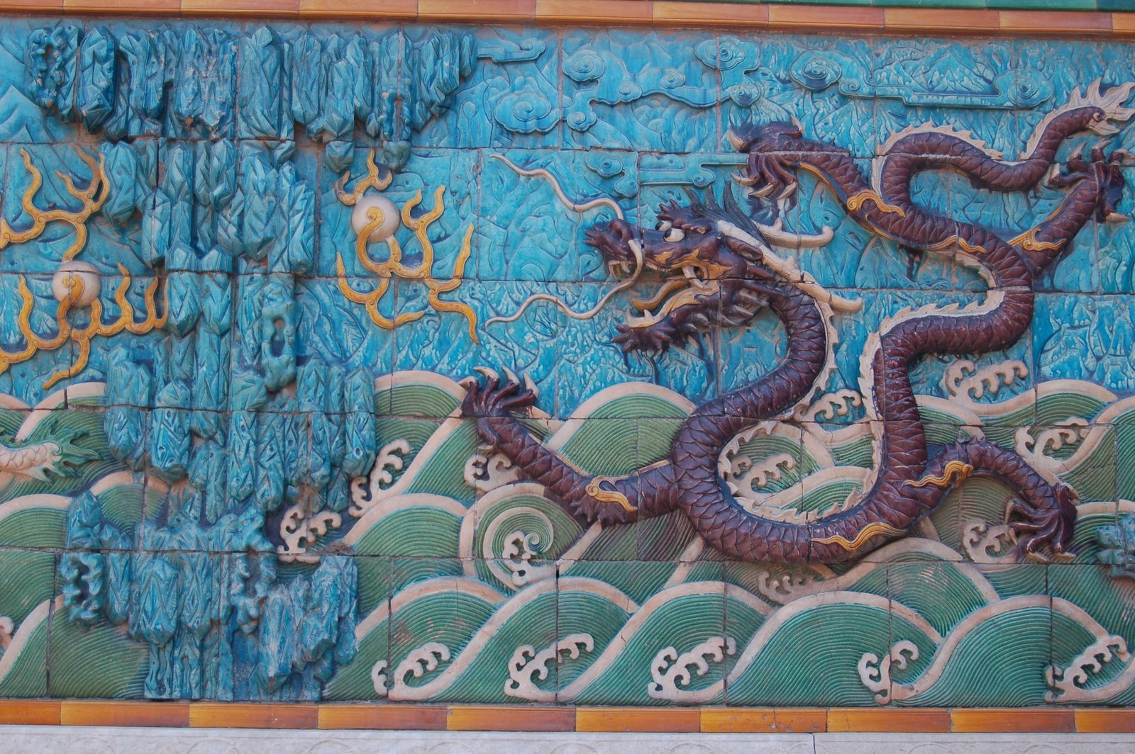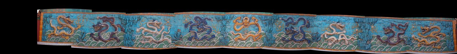 Panel one of the The Nine Dragons Screen. The entire mural is about 40 feet wide, made of ceramic tile work. Imperial Palace, Beijing, China.