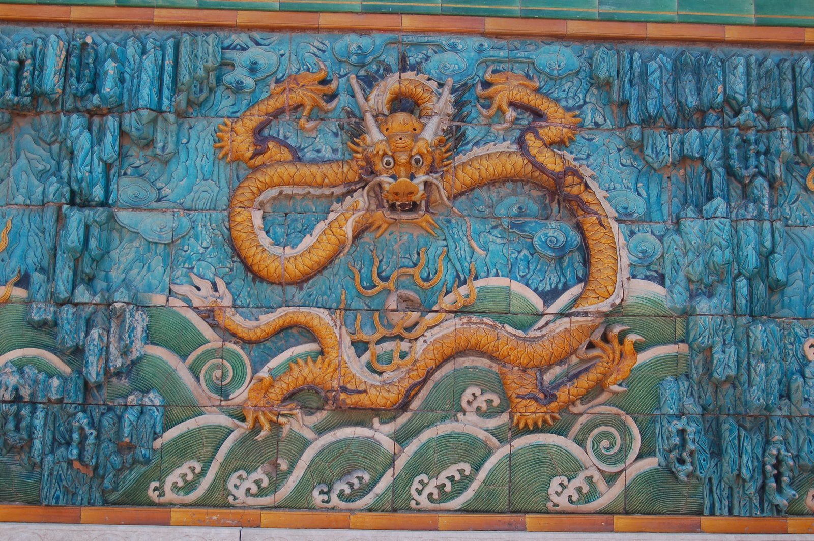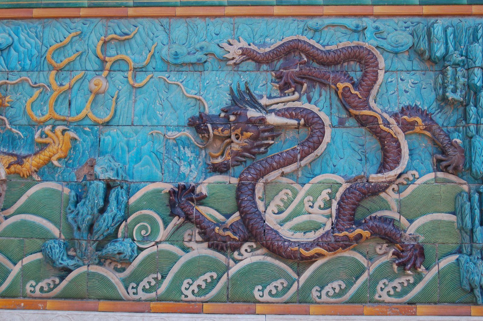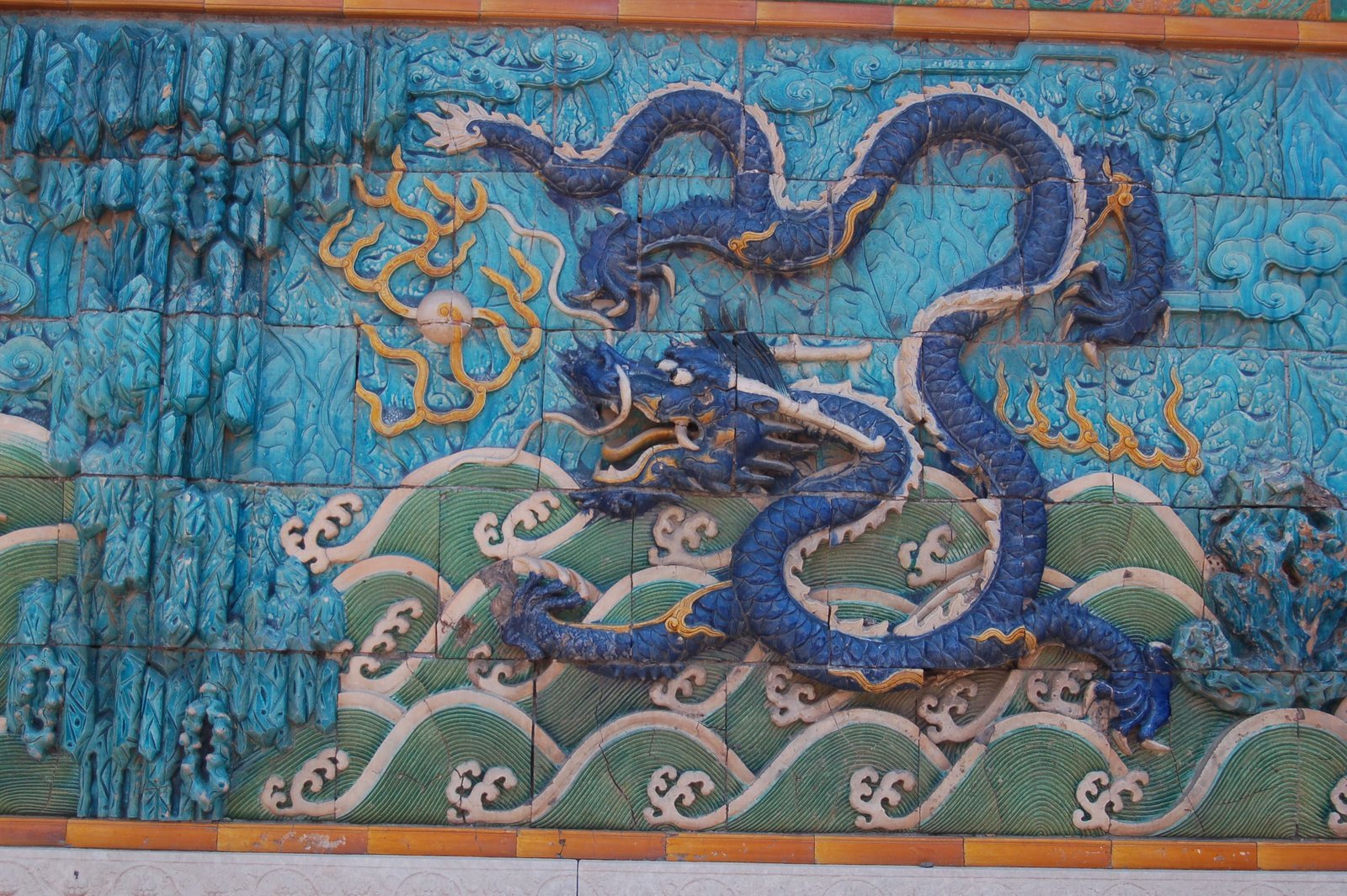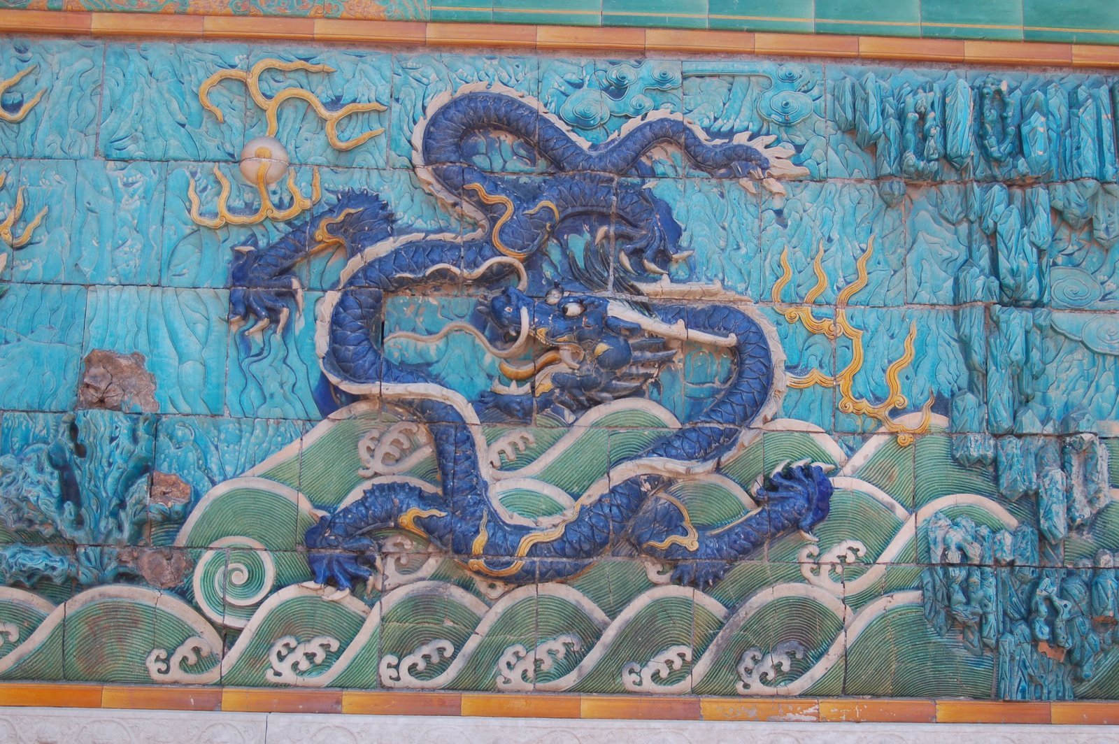 Panel one of the The Nine Dragons Screen. The entire mural is about 40 feet wide, made of ceramic tile work. Imperial Palace, Beijing, China.