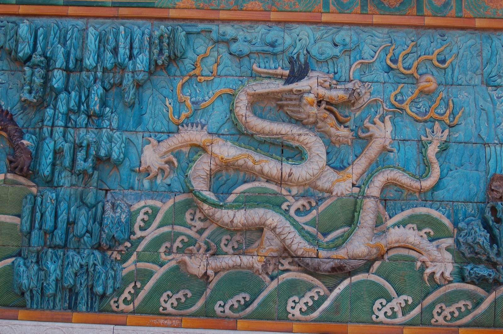 Panel eight of the The Nine Dragons Screen. The entire mural is about 40 feet wide, made of ceramic tile work. Imperial Palace, Beijing, China.