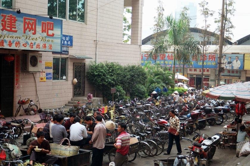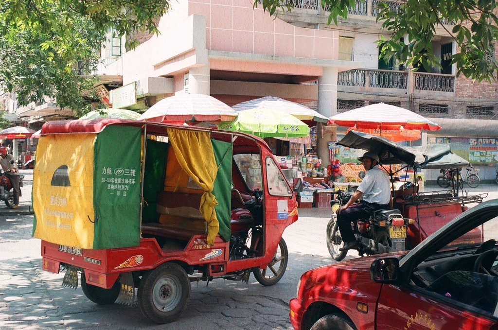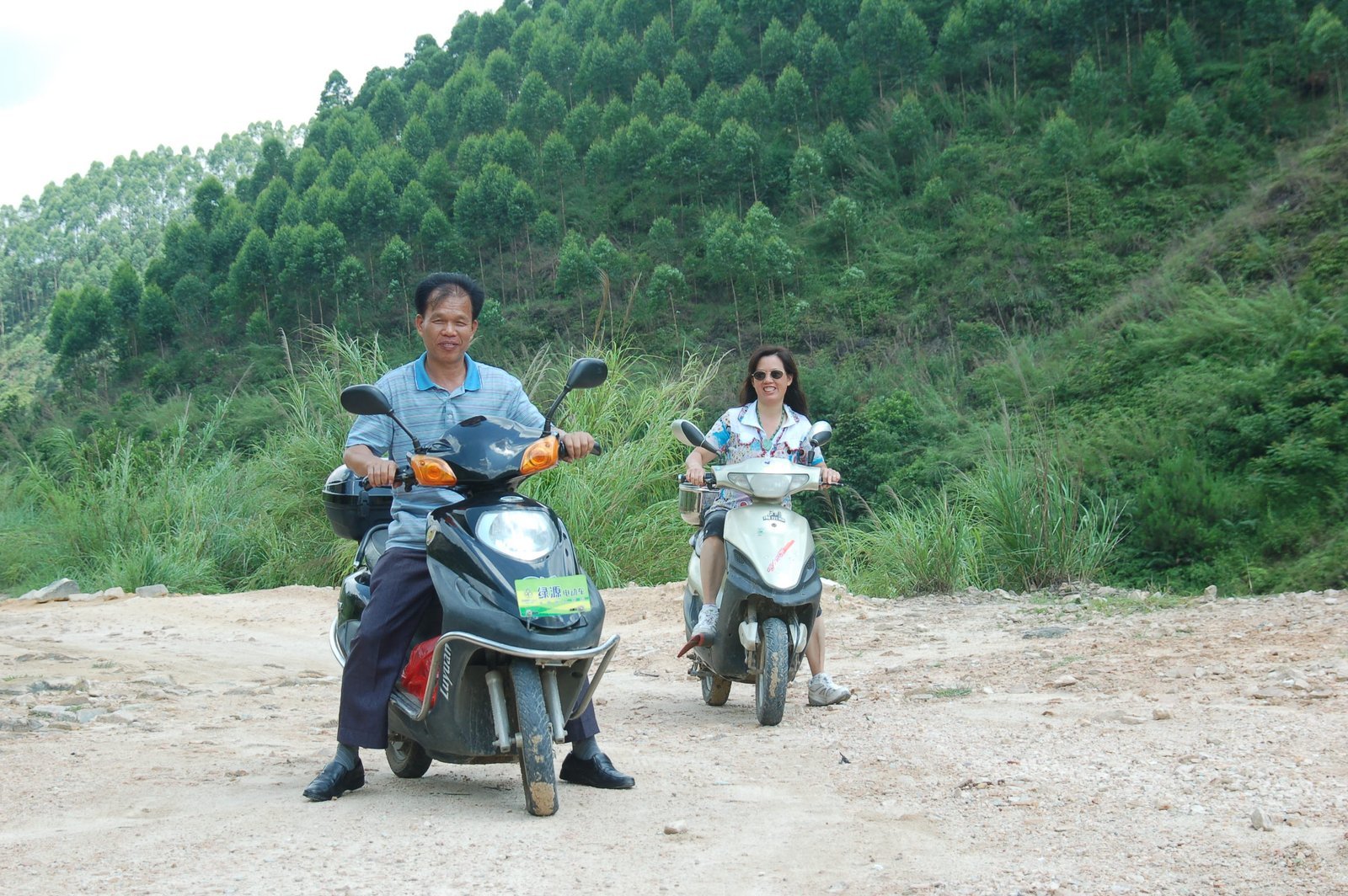 Weifang and her eldest sister's husband on electric mopeds. Luchuan, China