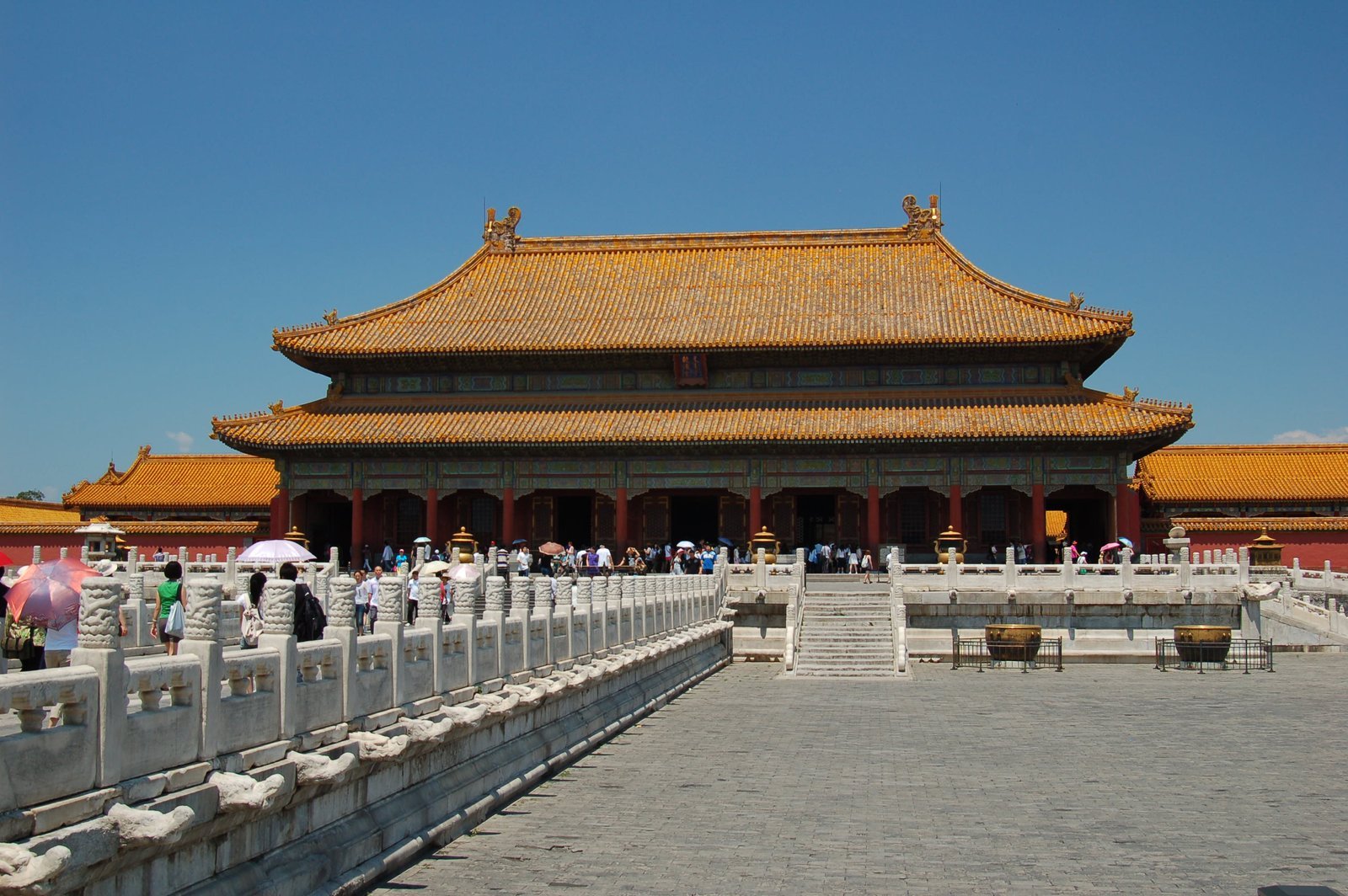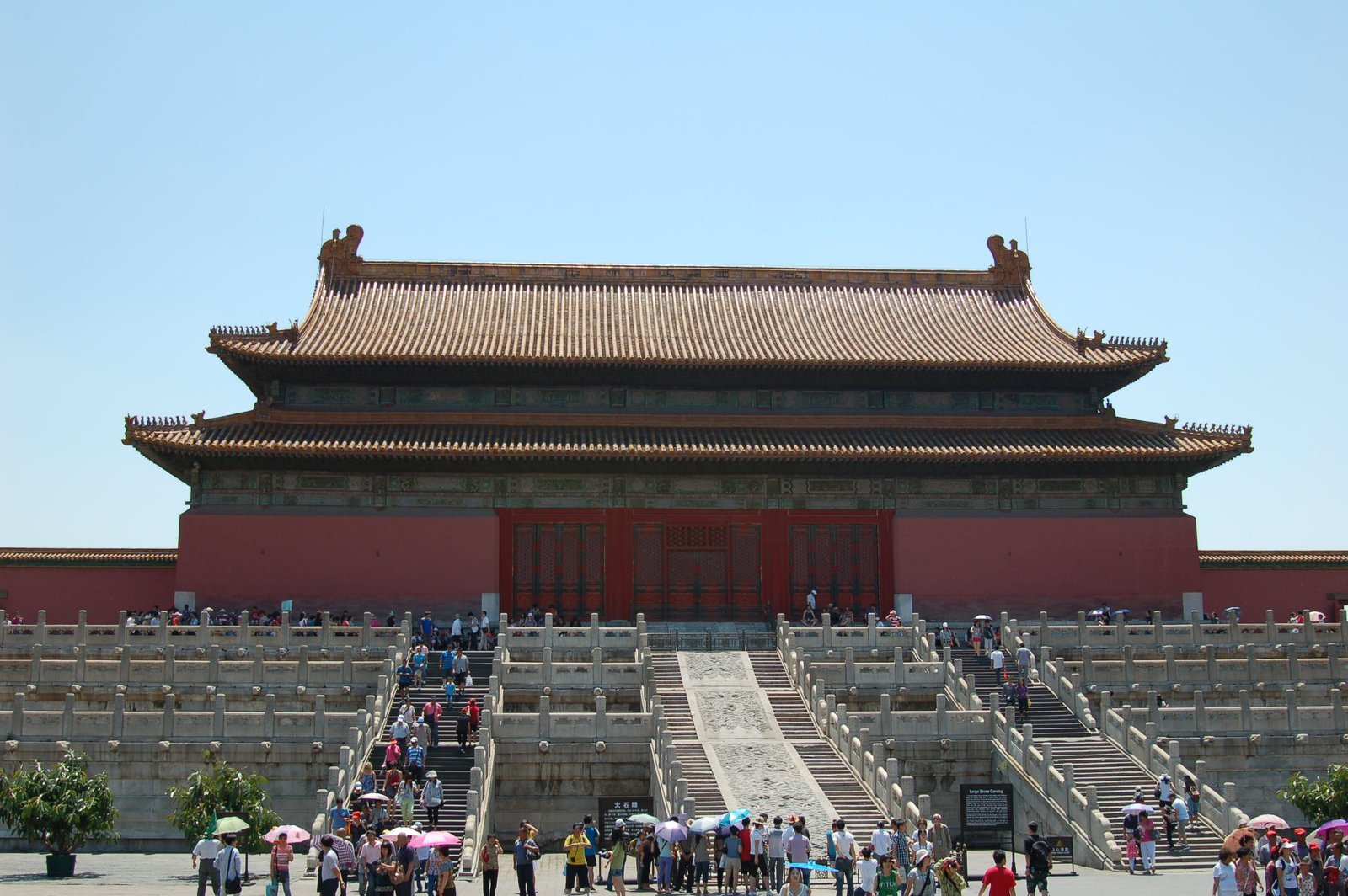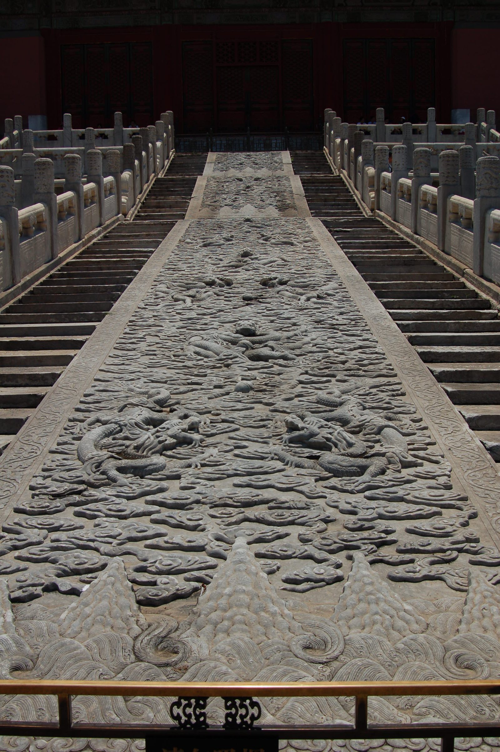 The Hall of Supreme Harmony, Imperial Palace. The stone between the staircase is called "Large Stone Carving," and is the single largest carved stone in the palace complex. Beijing, China