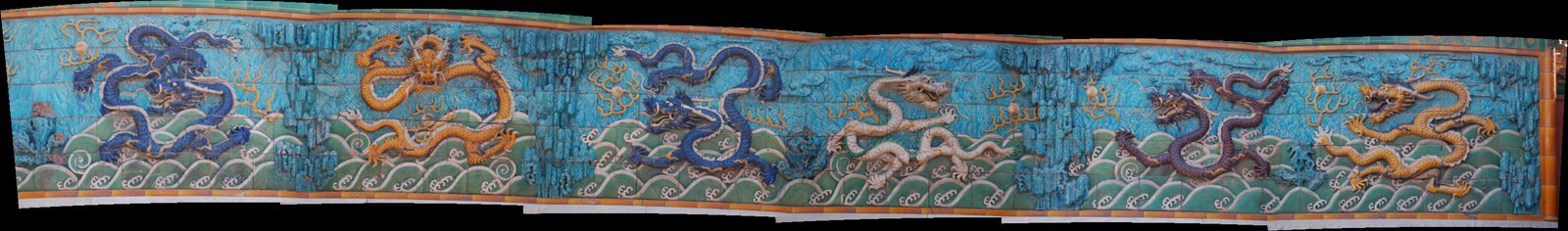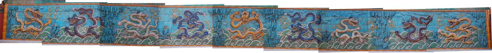 A composite image of all nine panels of the Nine Dragons Mural in the Imperial Palace. This mural is about 45 feet wide and made of glazed tile. The images were taken with a hand-held Nikon D50 camera. Beijing, China