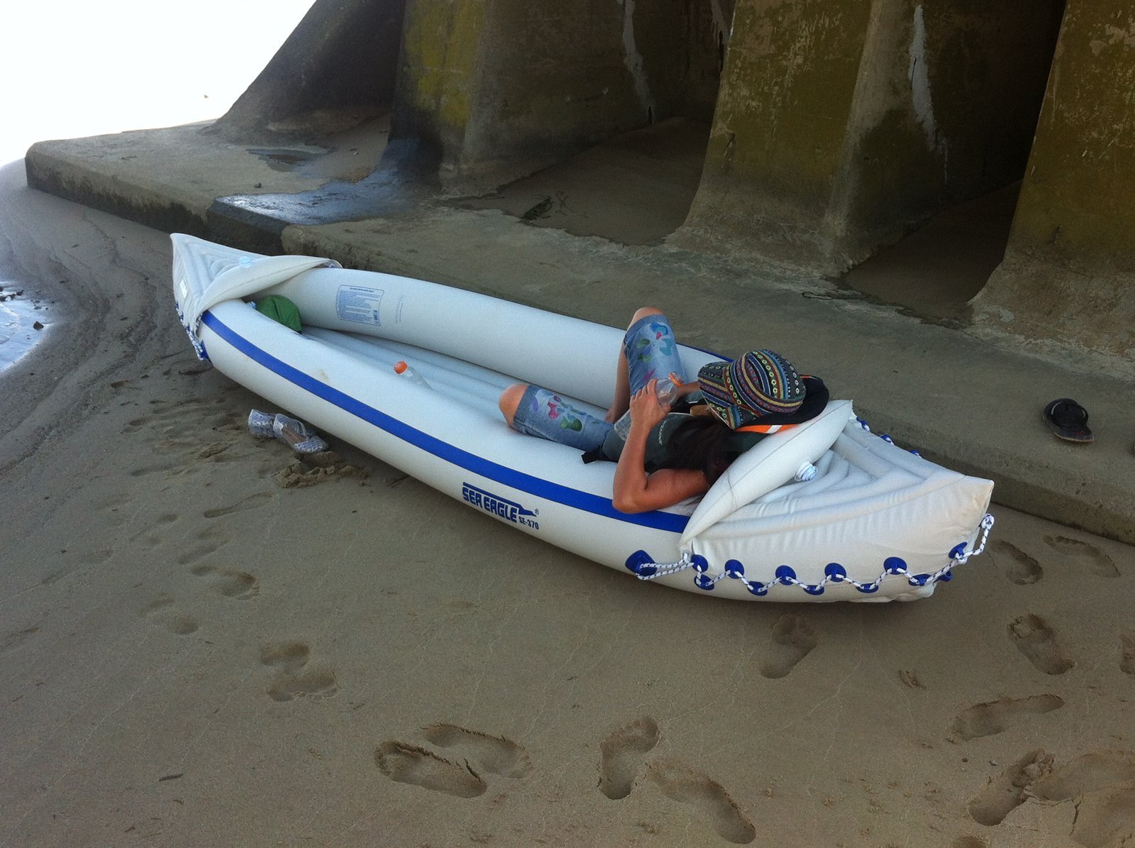 After a hard paddle, Winnie takes a well-earned rest in the Sea Eagle SE-370, pulled up under the train bridge at the mouth of Powells Creek. You cannot do this in a hard shell kayak!