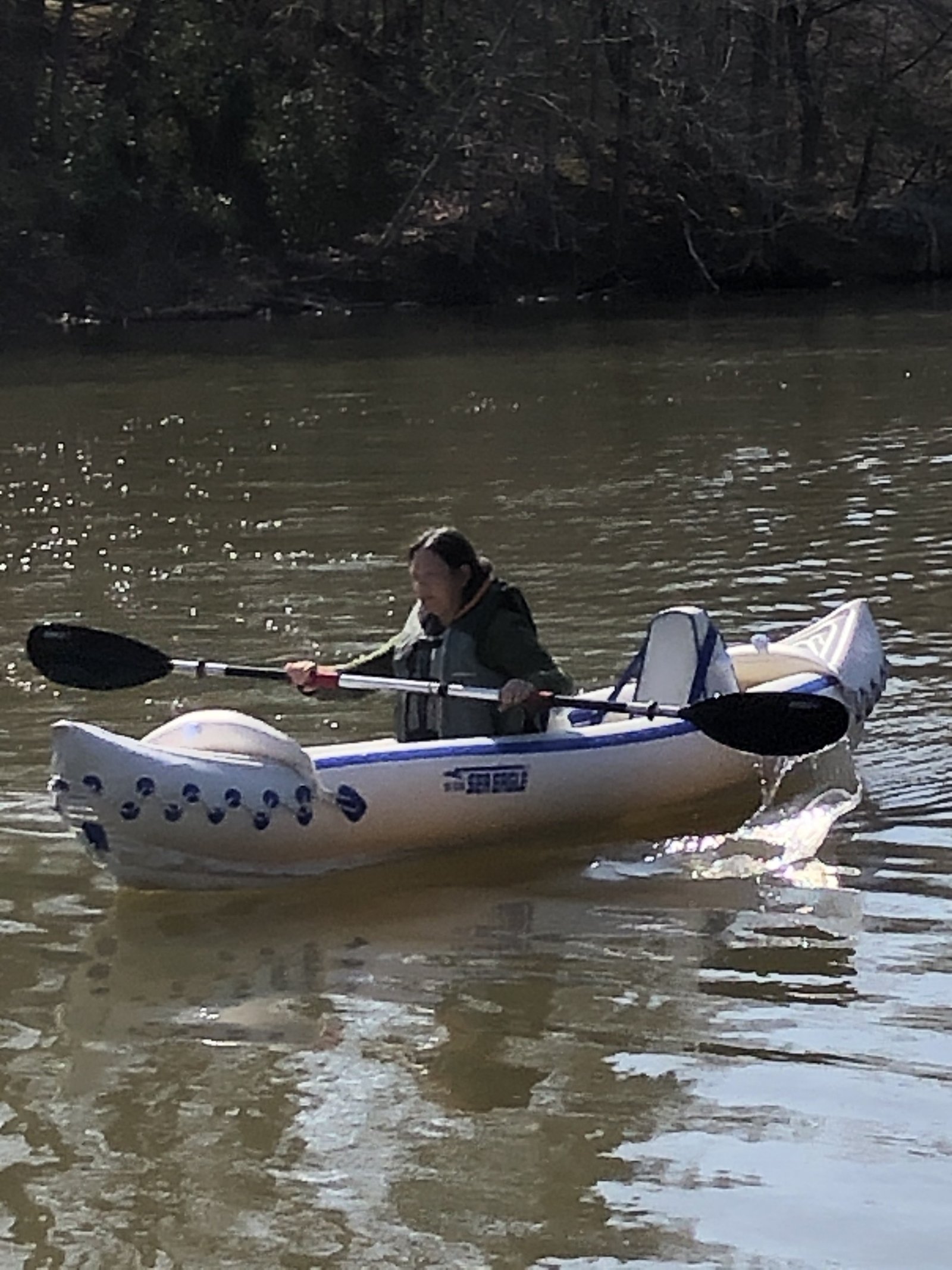 Winnie paddling solo in our Sea Eagle 370 "Nemo," in Mattawoman Creek, Smallwood State Park, Maryland. The Sea Eagle was launched from our Bayliner 175BR "Sea Dragon."