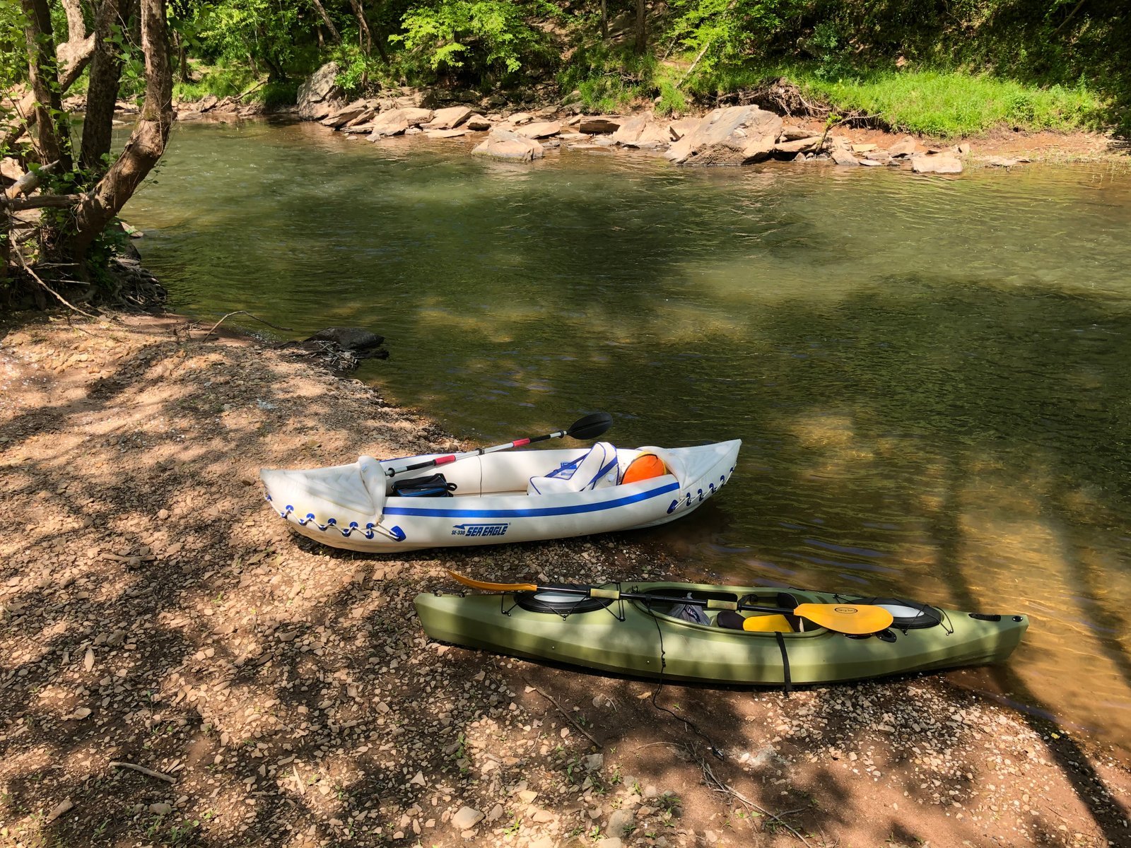 Two great kayaks beached along the Bull Run River