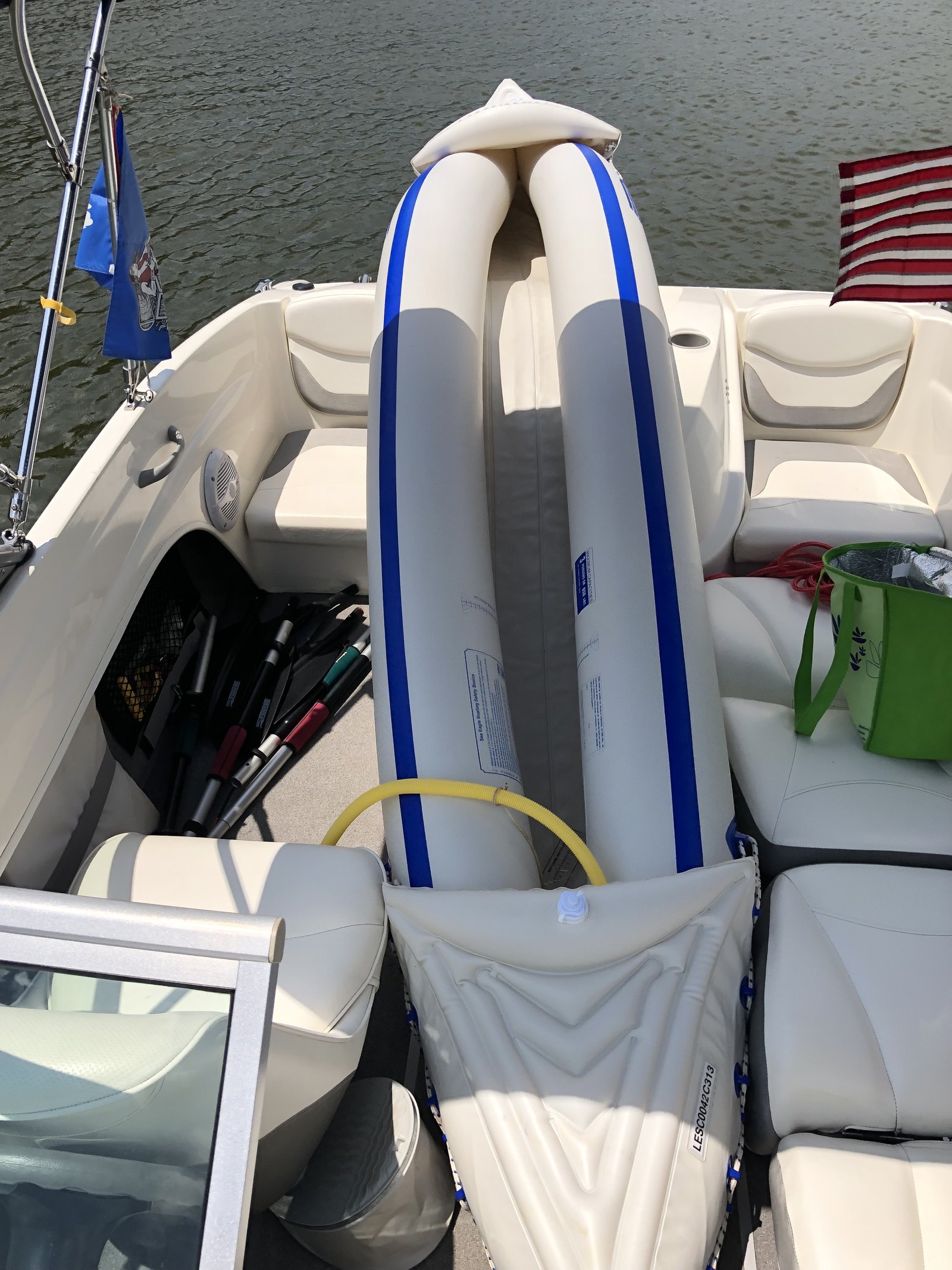 Winnie testing out how the new HO Sports Beacon thirteen foot inflatable handles for napping. This boat has been named "Dragonfly."