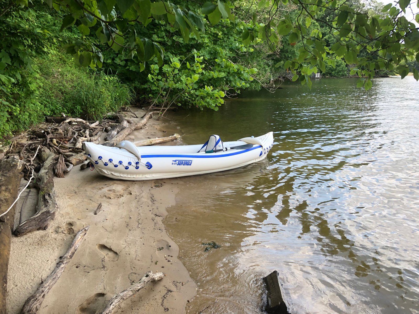 Exploring the beach along Mattawoman Creek, off Smallwood State Park, Maryland, from our Sea Eagle 370 "Nemo," rigged for solo paddling.