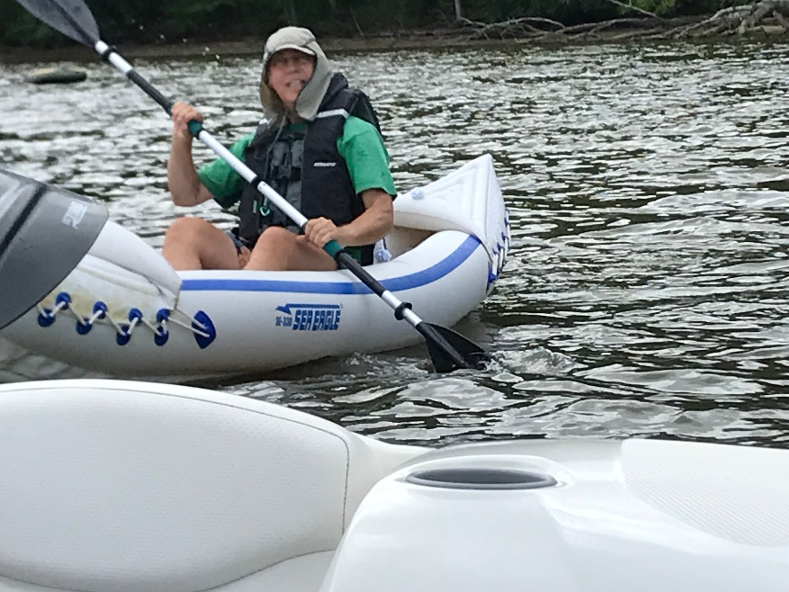 Ron in the Sea Eagle 330 "Lucky" after launching from our Bayliner 175BR "Sea Dragon. Gunston Cove, off Pohick Bay Regional park, Virginia