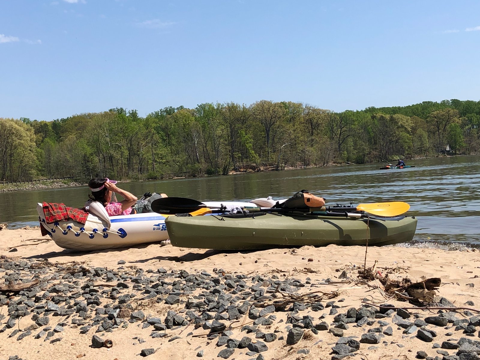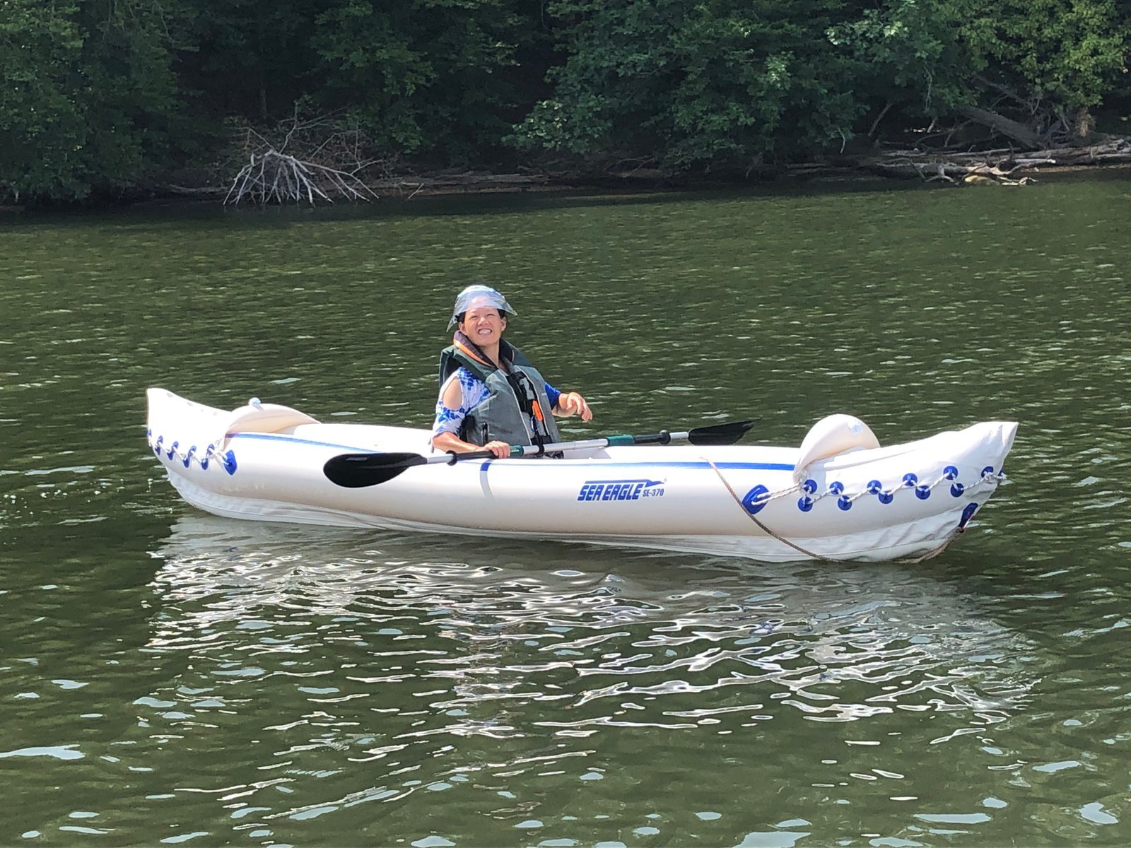 Winnie paddles solo on our Sea Eagle 370 "Nemo II," at River Bend Regional Park, Fairfax County, Virginia. Just above Great Falls National Park on the Potomac River.
