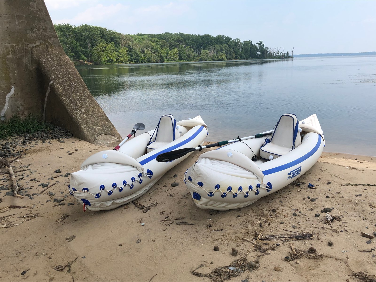 Our Sea Eagle 370 "Nemo" next to our Sea Eagle 330 "Lucky." On a sand bar under the railway bridge crossing Powell's Creek. Potomac River, Virginia.