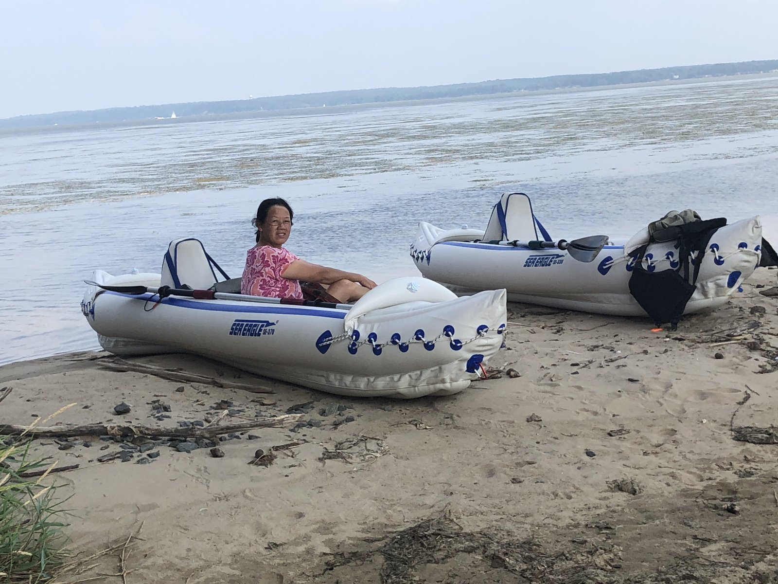 Winnie started kayaking with me in 2018, and she quickly mastered paddling around. We now regularly go out paddling together, either in our tandem inflatable or each in a single-seat kayak. We’ve also mastered the art of launching an inflatable kayak from our 18-foot boat Sea Dragon.