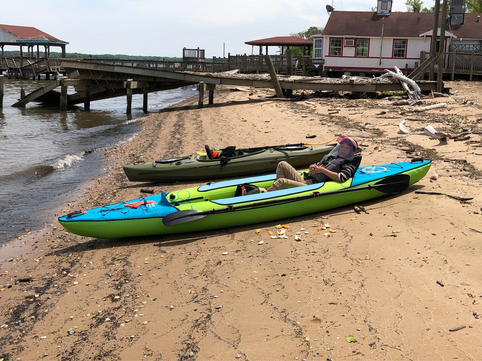 Taking a lunch break at the beach off Curtis Tikis' Dockside Restaurant and Tiki Bar at Colonial Beach, Virginia. More accurately, we were beached in maryland, as the state line runs through the dune grasses just past the beach line.