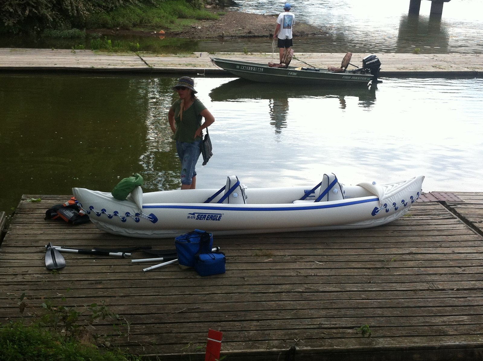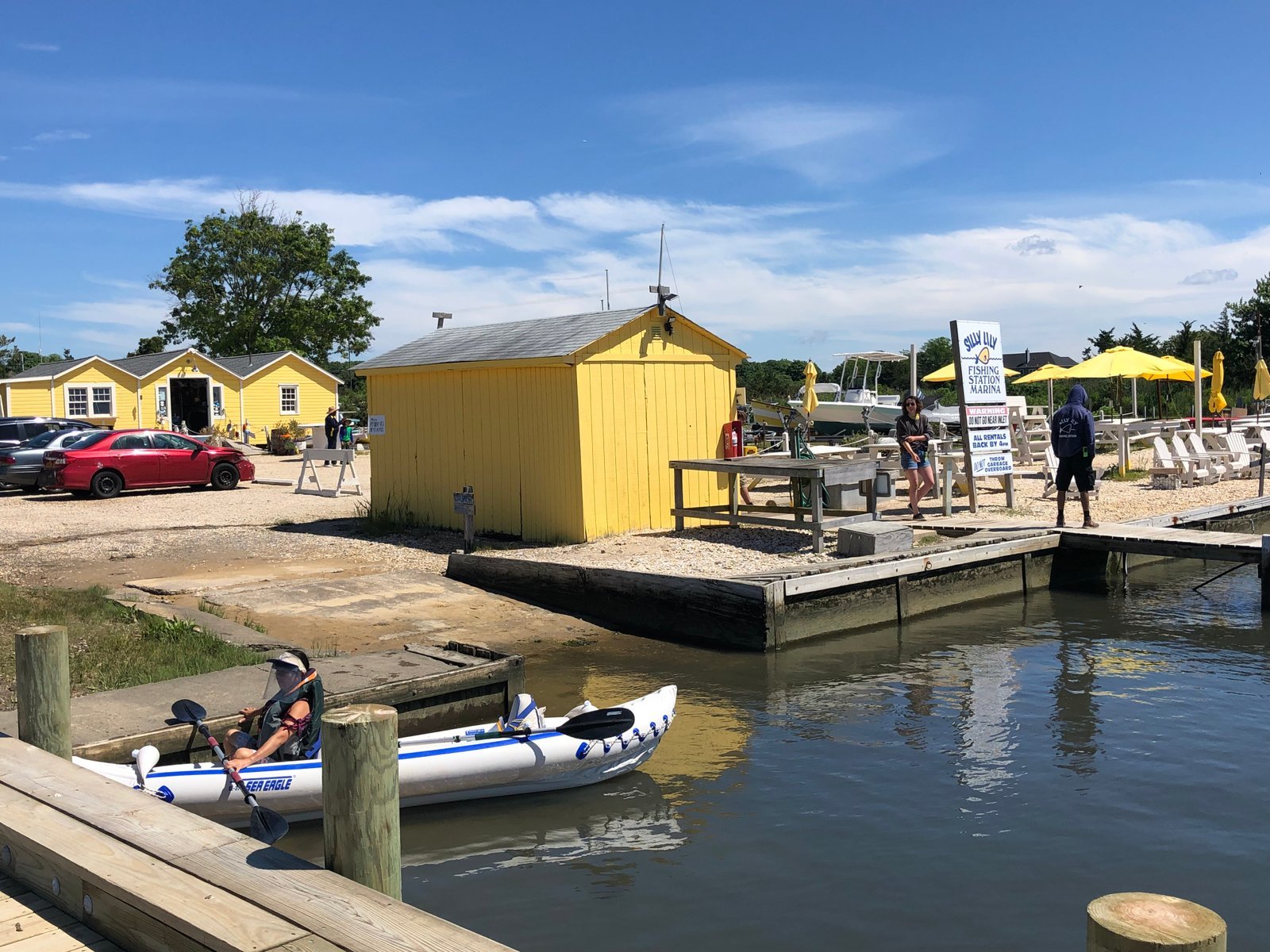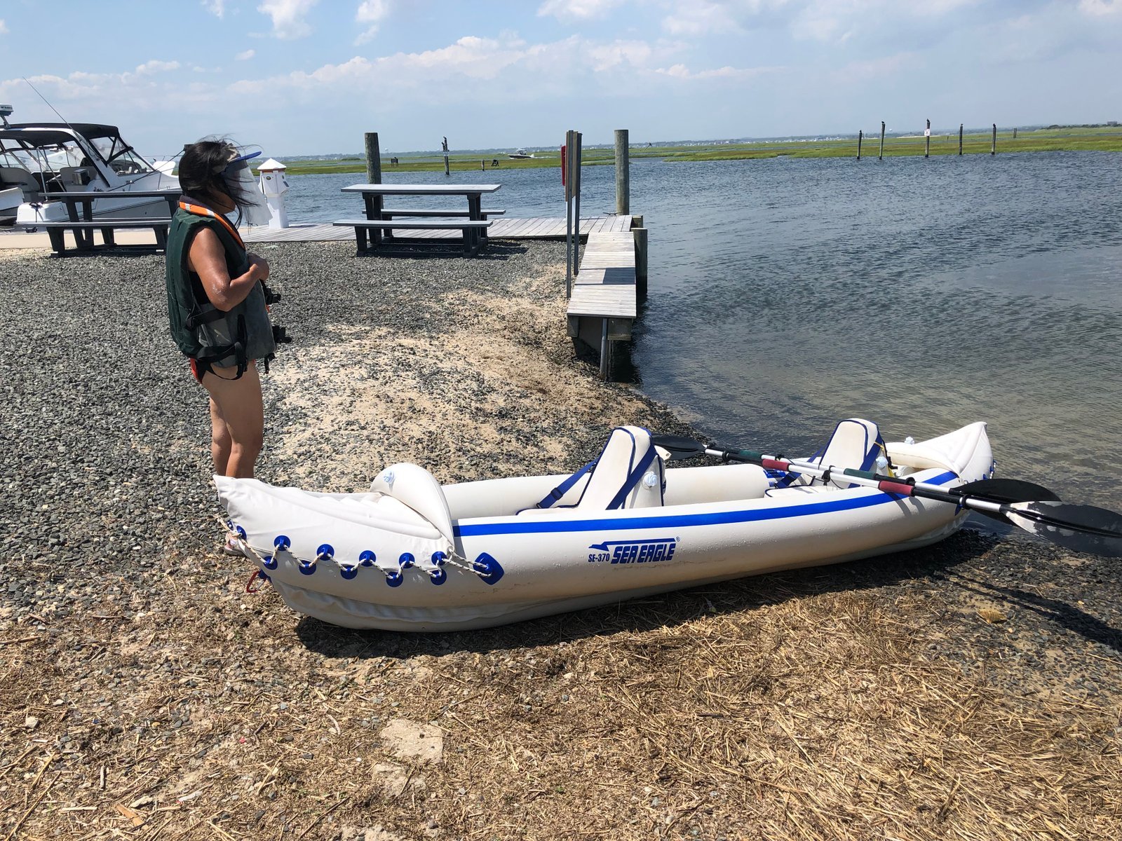 Winnie in the Sea Eagle 370 "Nemo," ready to paddle out of Silly Lily Fishing Station at East Moriches bay, Long Island, New York. Silly Lily has been in business since 1934 renting out fishing skiffs and other small boats.