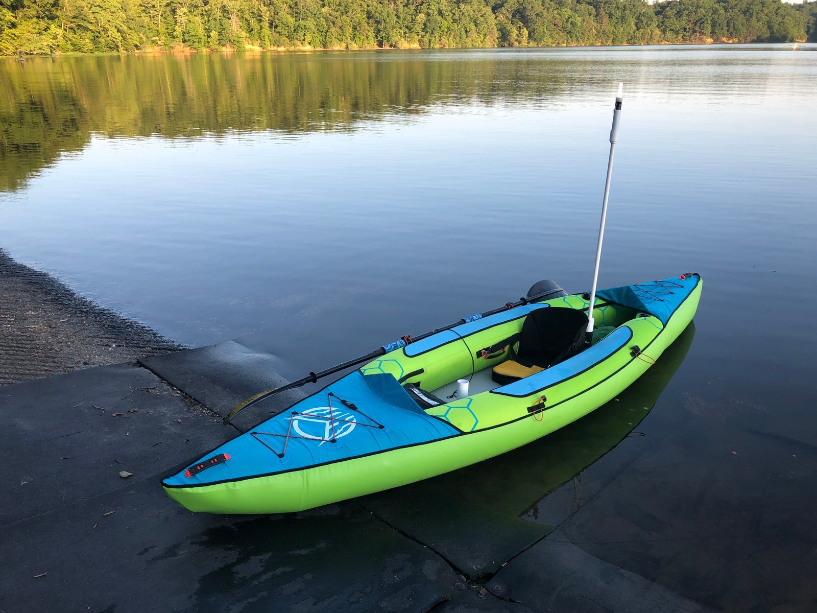 Our HO Sports beacon "Dragonfly" rigged with a homebuilt safety light mast, on the boat ramp of Occoquan Reservoir at Fountainhead Regional park, Virginia. A white all-around white light is needed for night kayaking.