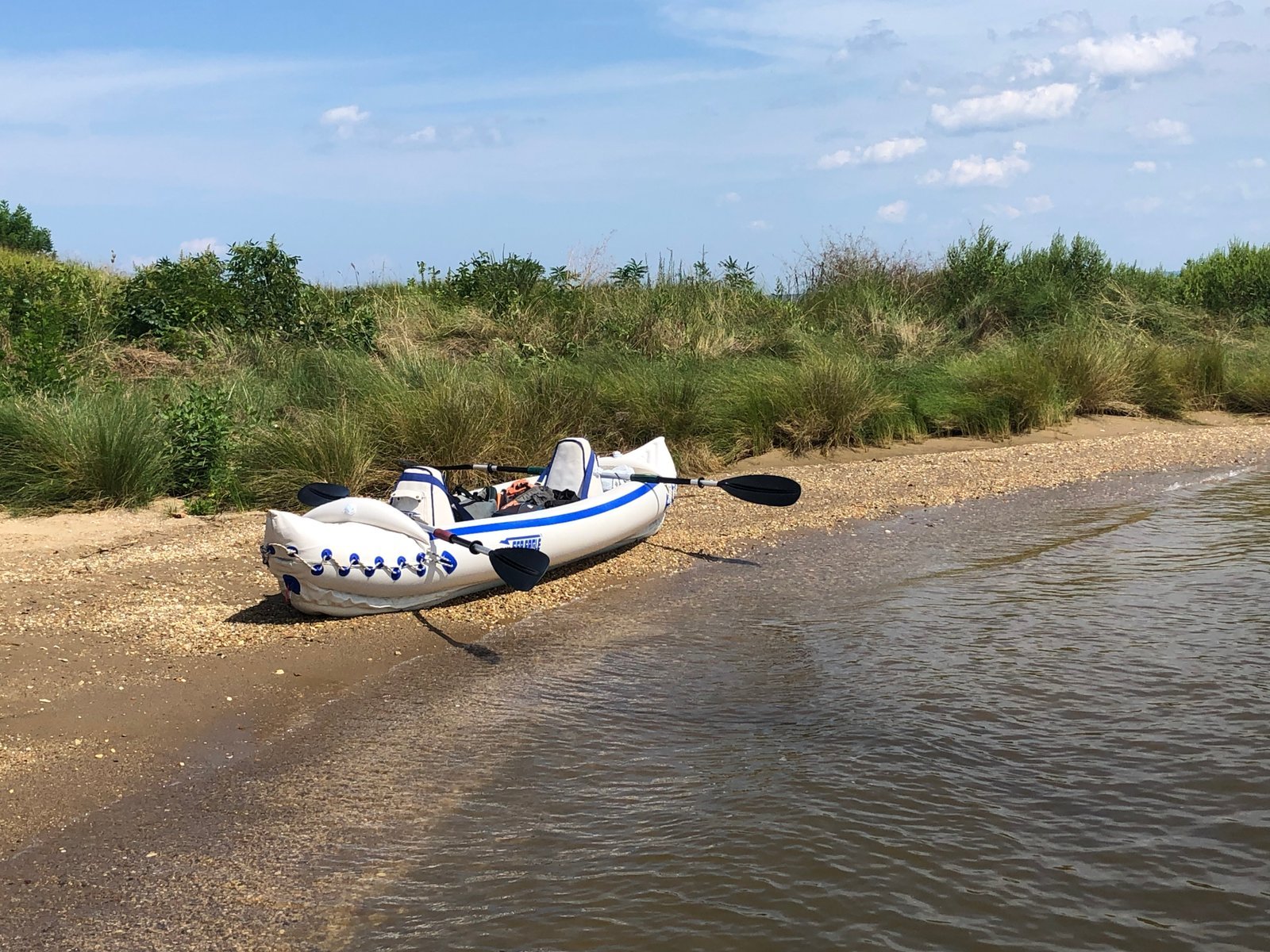 We brought our Sea Eagle 370 Nemo with us on a vacation trip to Groton, Connecticut, and had a chance to do some salt water kayaking. On a gravel beach at Bluff Point Coastal Reserve.