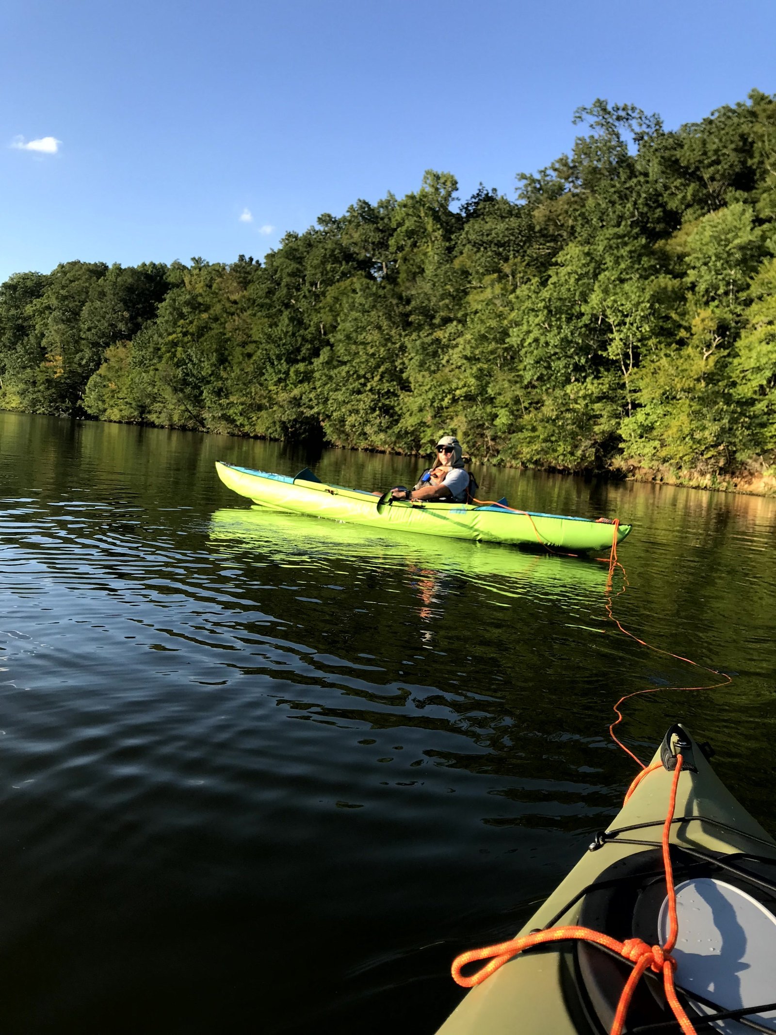 Ron had to take Winnie's kayak under tow, when Winie suffered a massive loss of energy while paddling in Occoquan Reservoir.
