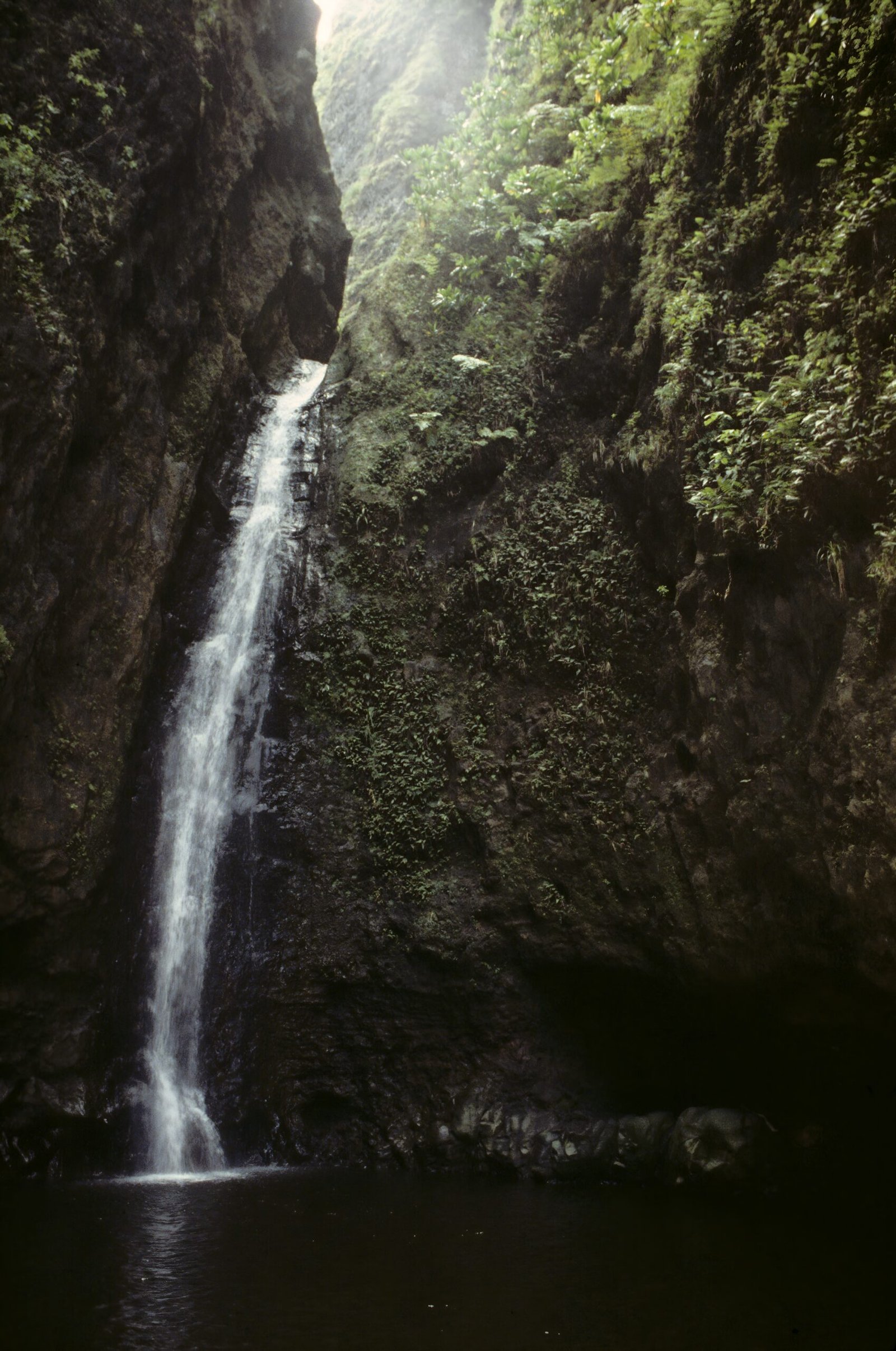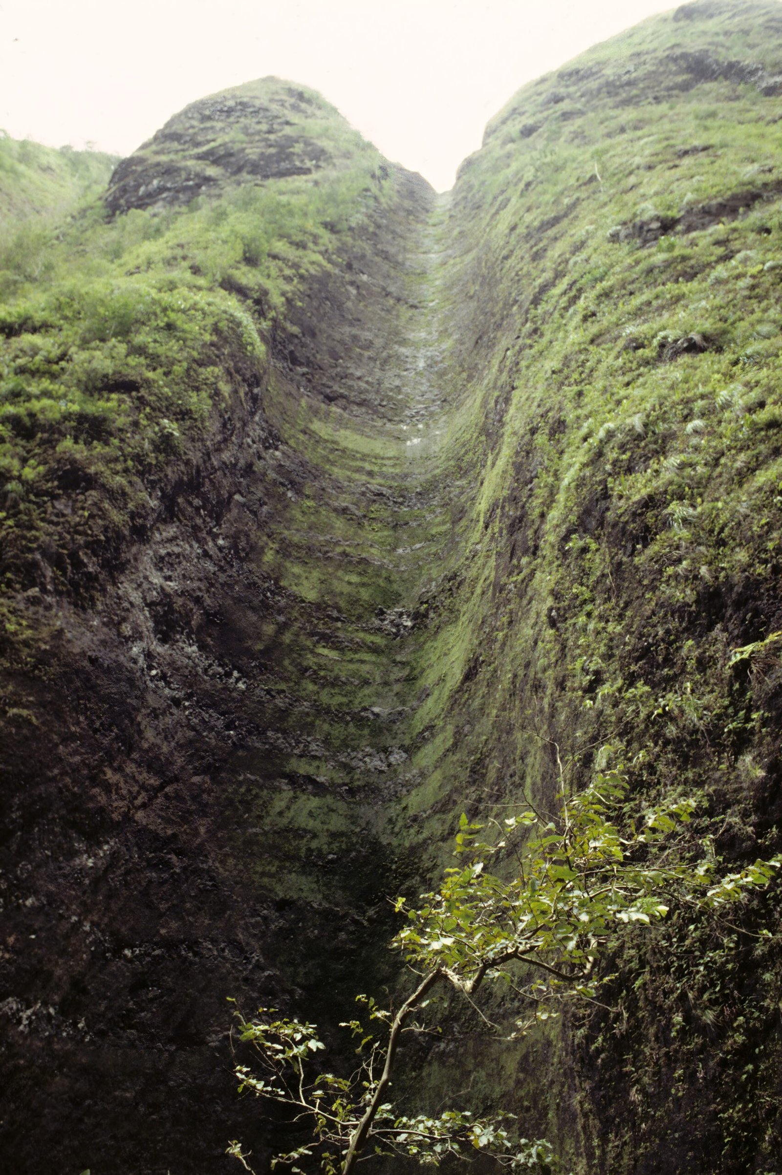 Looking up at the cliff walls on the trail leading to Sacred Falls. On Mother's Day in 1999 a landslide at the beginning of the access trail killed several people, and the trail has been officially closed ever since.