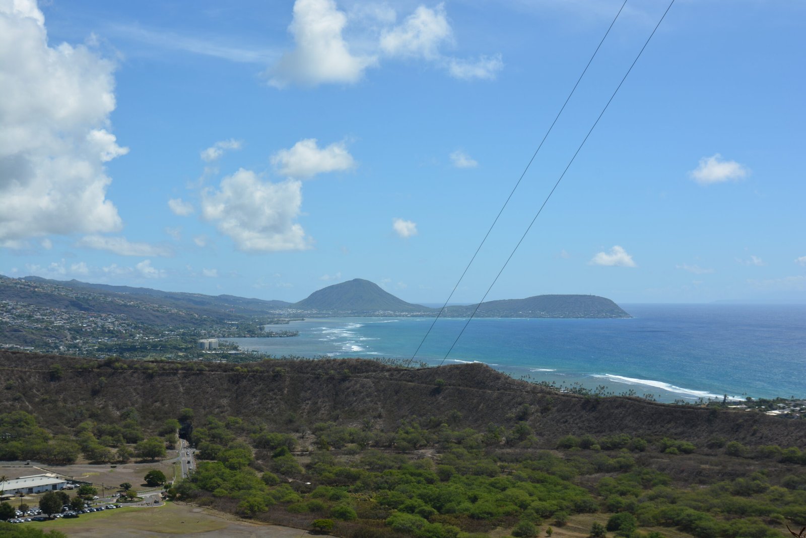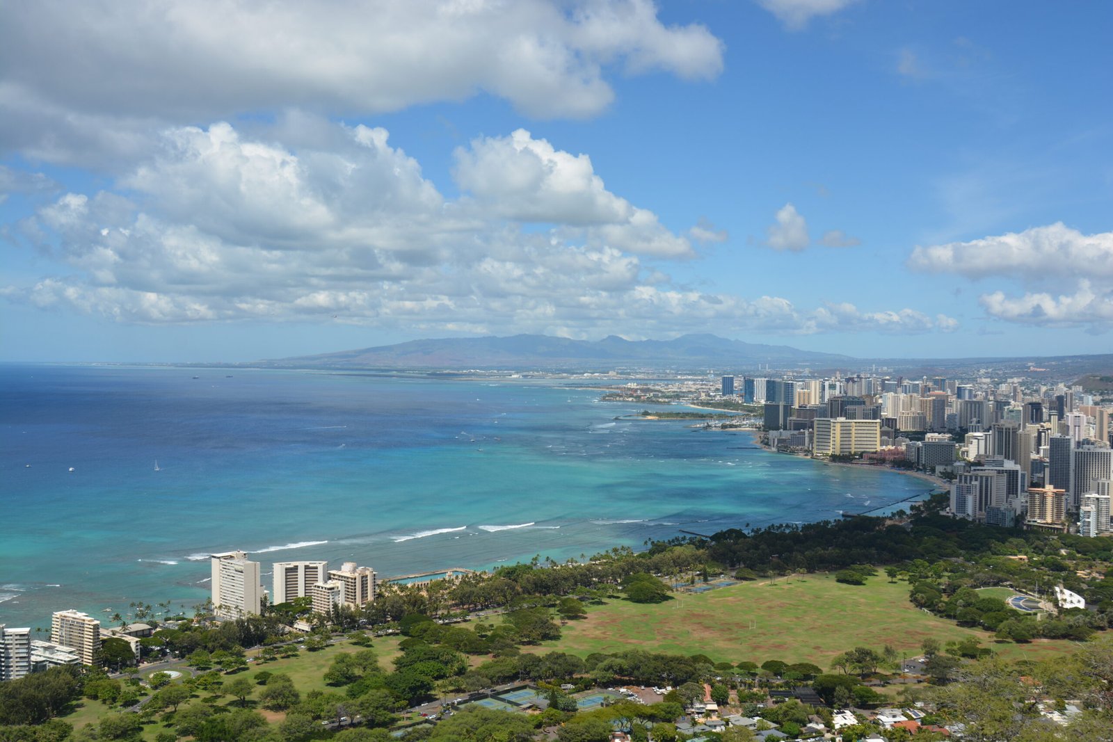 Looking west from the top of Diamond Head to Waikiki Beach and waterfront area.