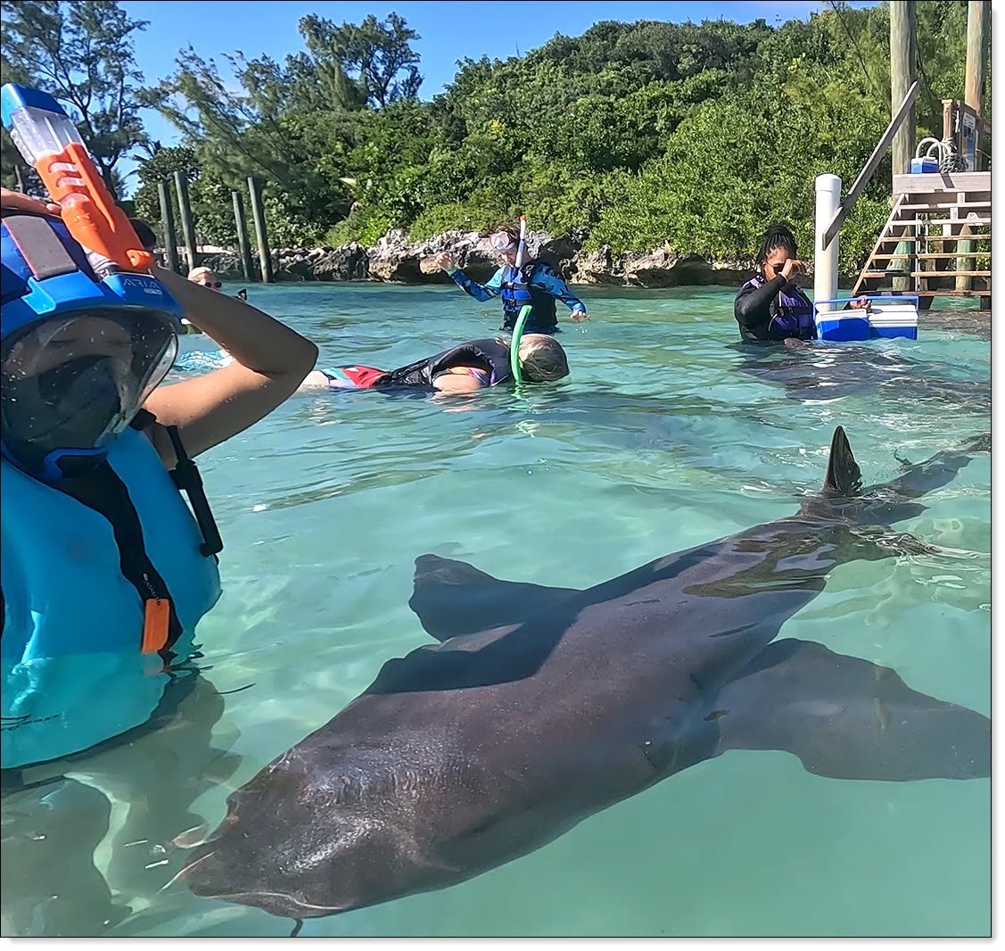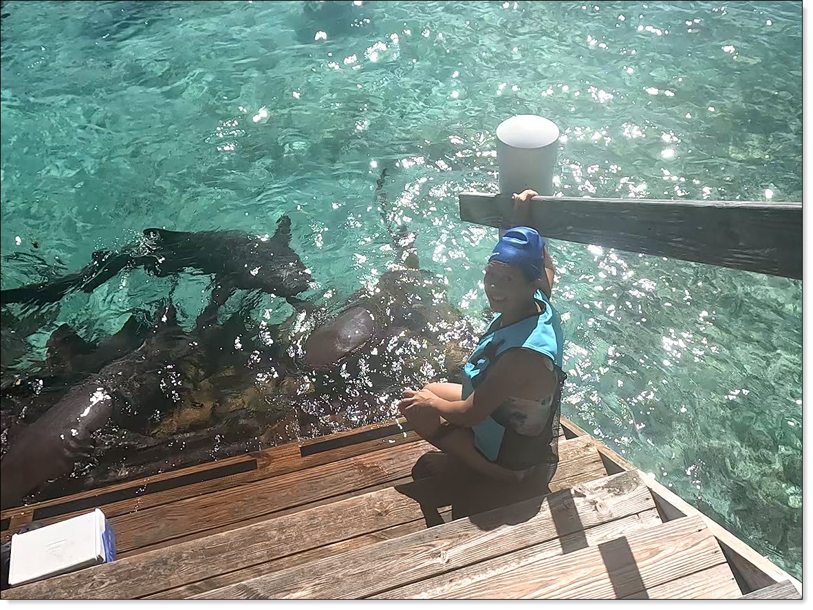 Winnie Getting Ready To Enter The Shark's Pen, at the Blue Lagoon Island "Shark Encounters" pen. This is a small island resort just outside of Freeport, Grand Bahama Island.