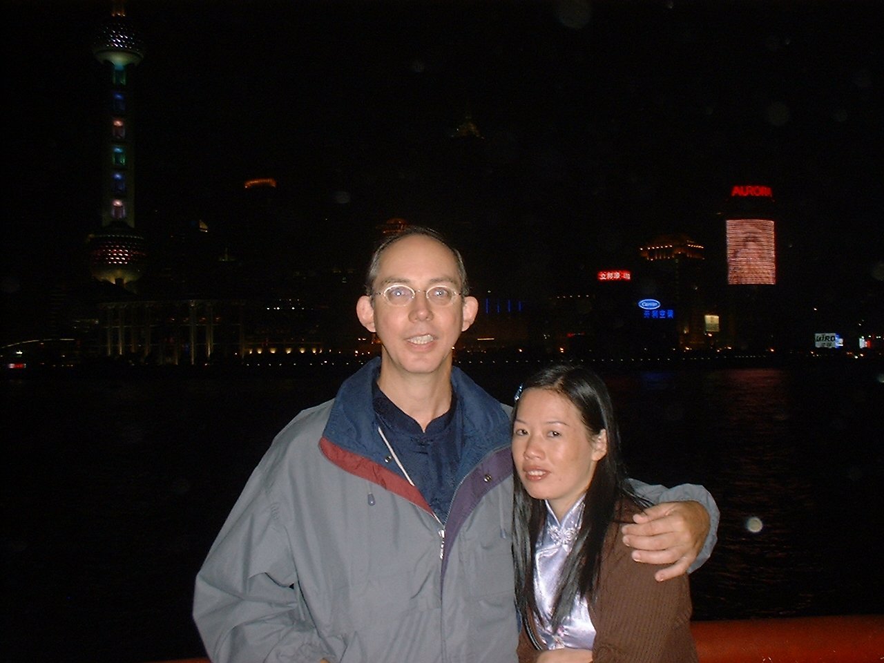 Ron and Winnie's honeymoon trip ended in Shanghai. This night phot was taken along the Bund, with the Orient Pearl tower in the background.