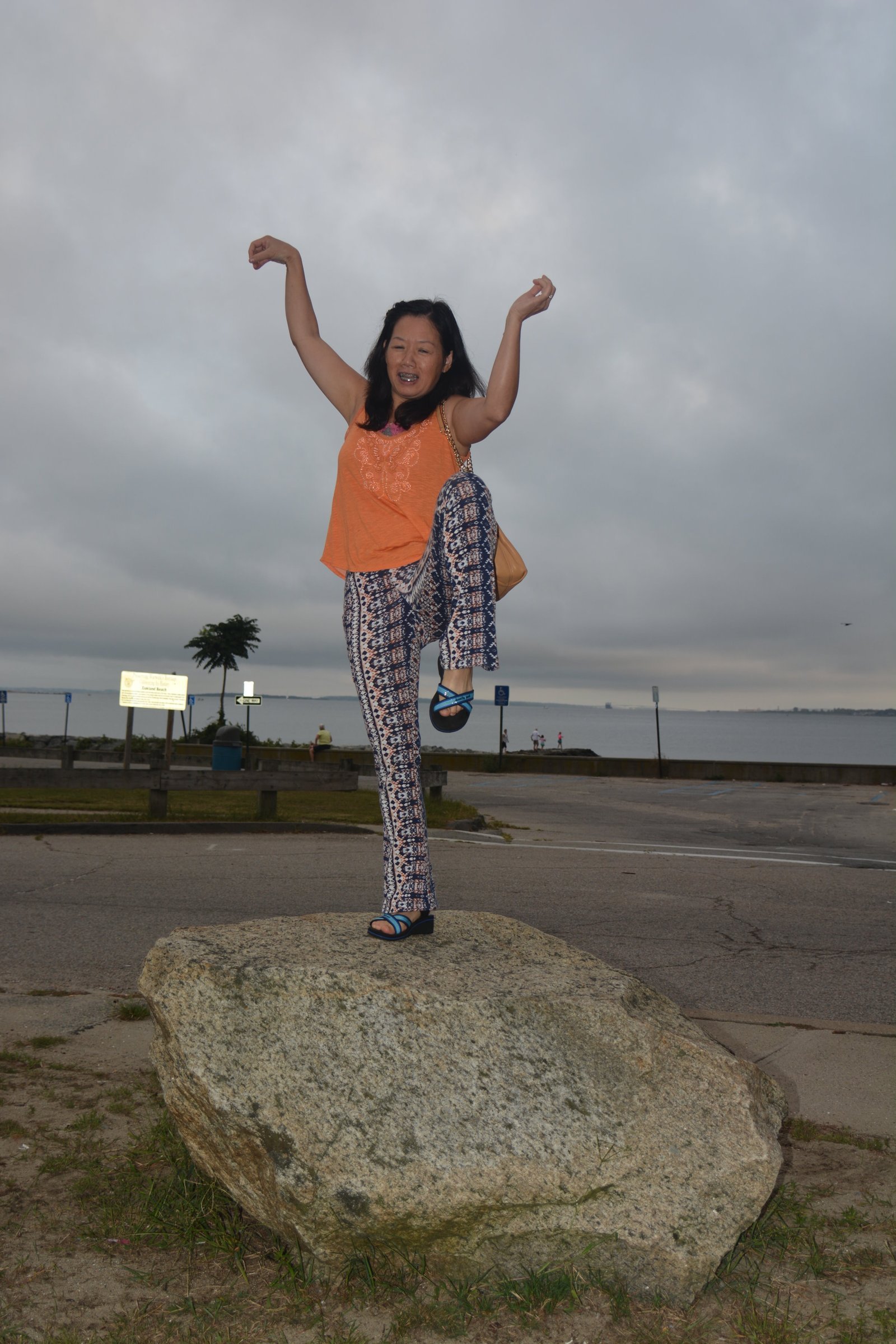 Winnie practicing Tai Chi and natural foot massage by walking barefoot on Pocket beach, along the Seattle, Washington, waterfront.