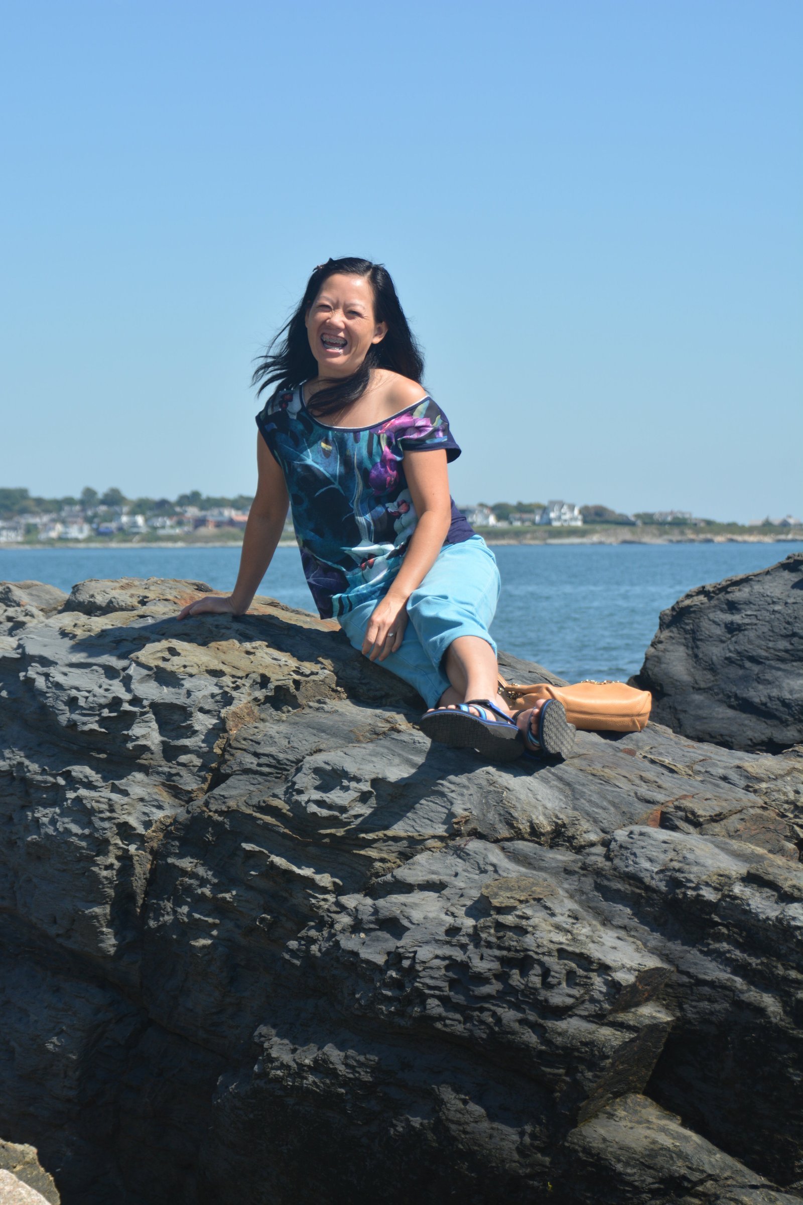 Winnie taking a nap on the jetty rocks at Galilee, Rhode Island