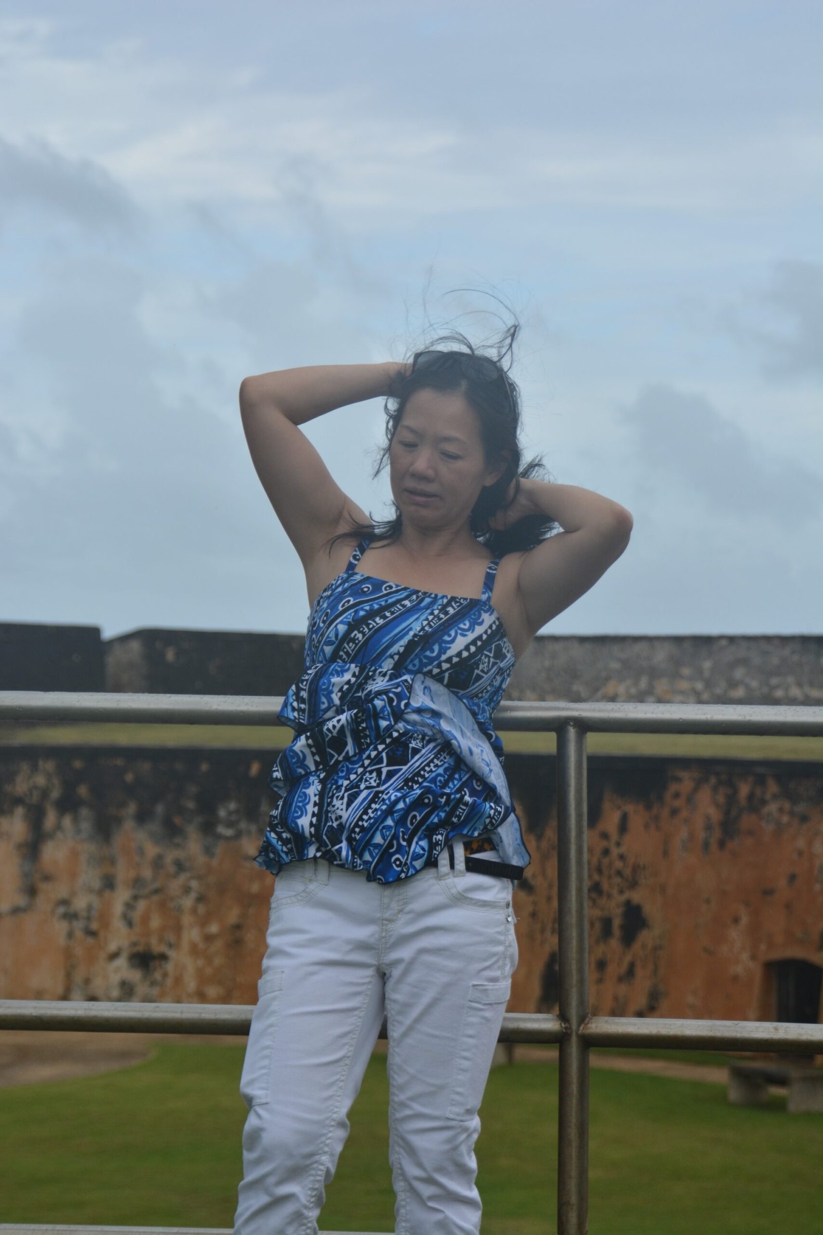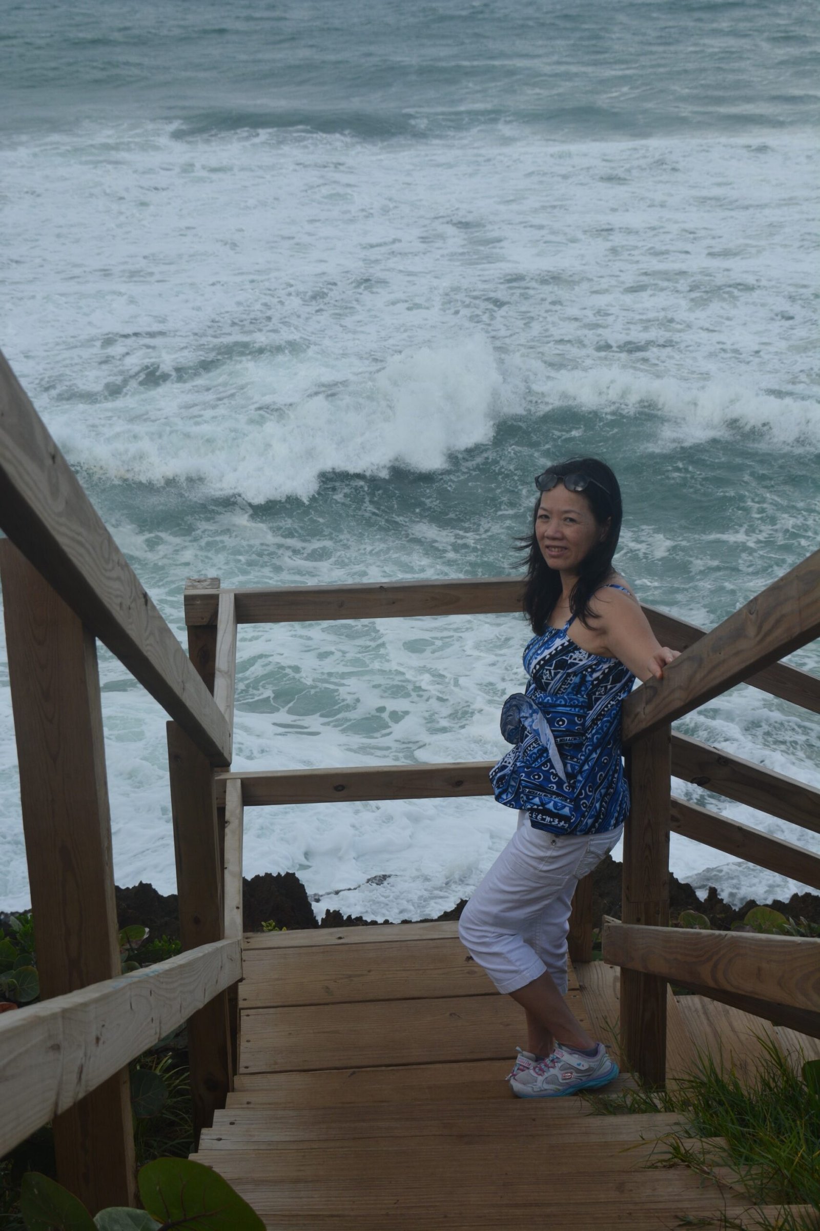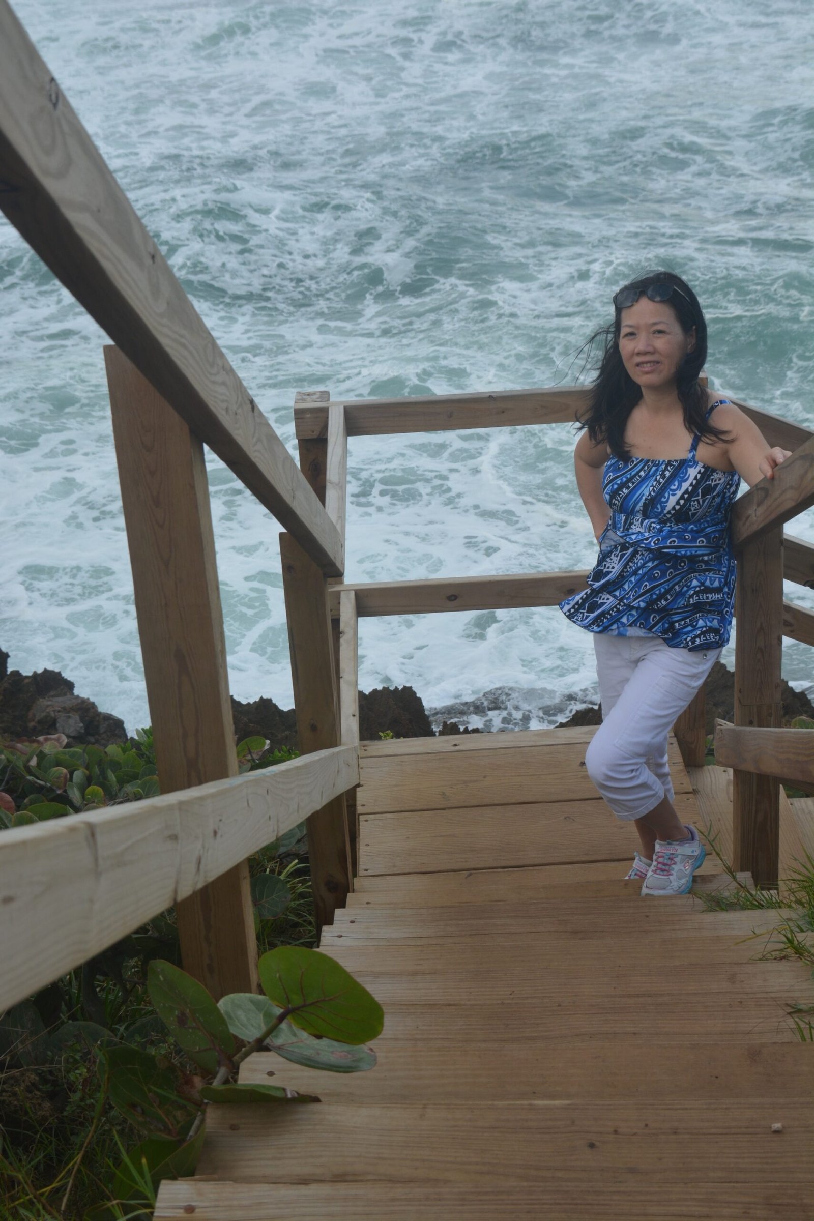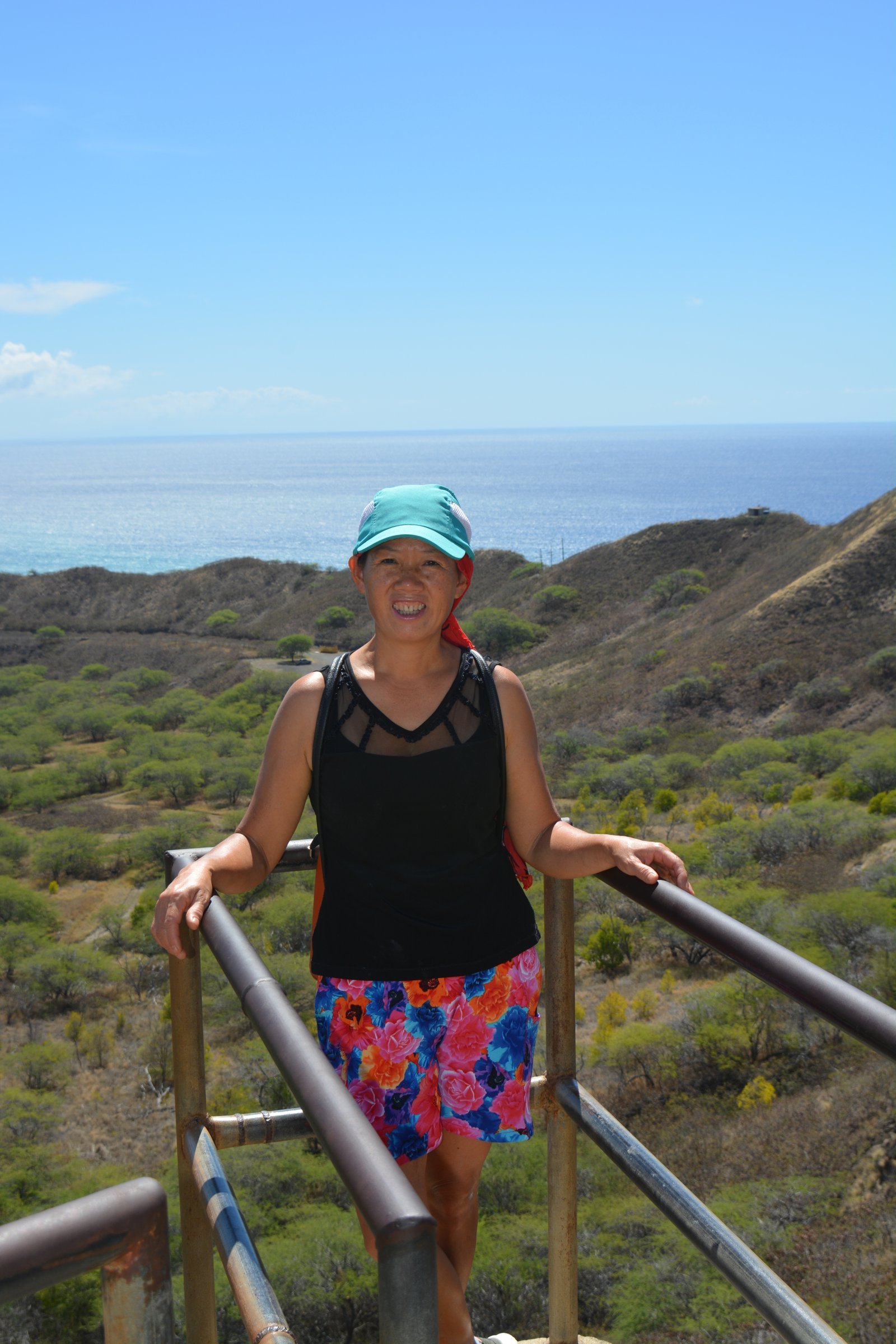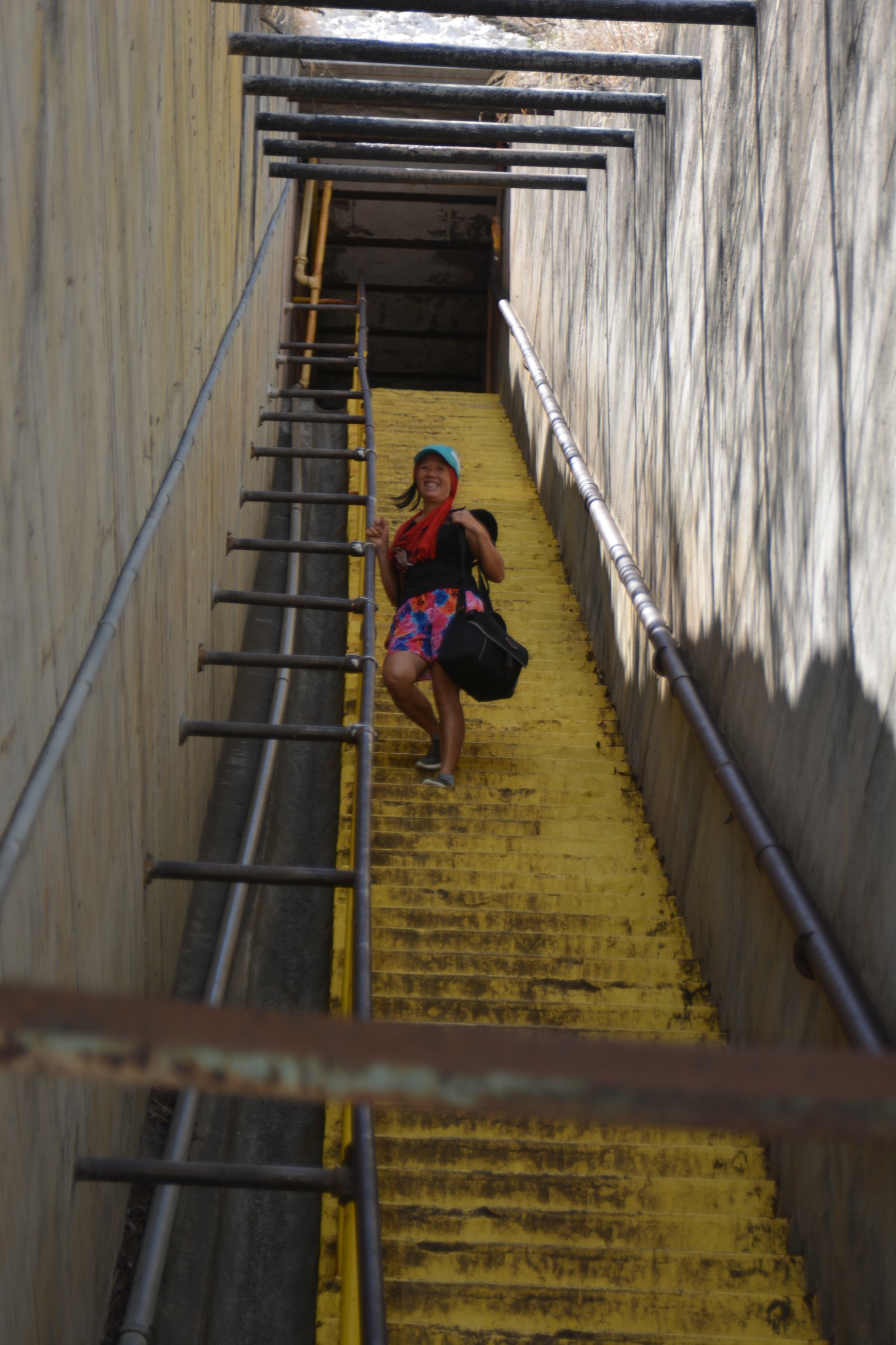Winnie posing on the ninety-nine stairs, the last staircase running to the top of Diamond Head National Monument.