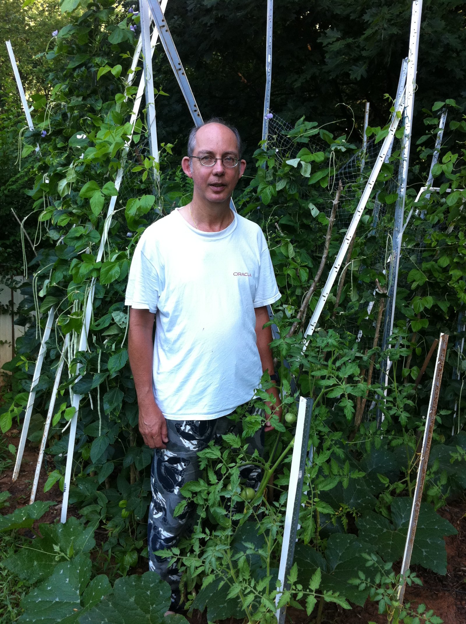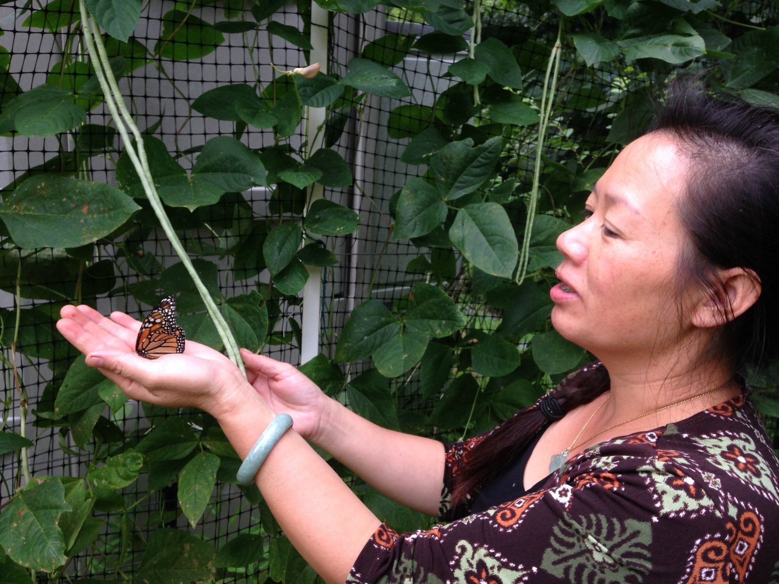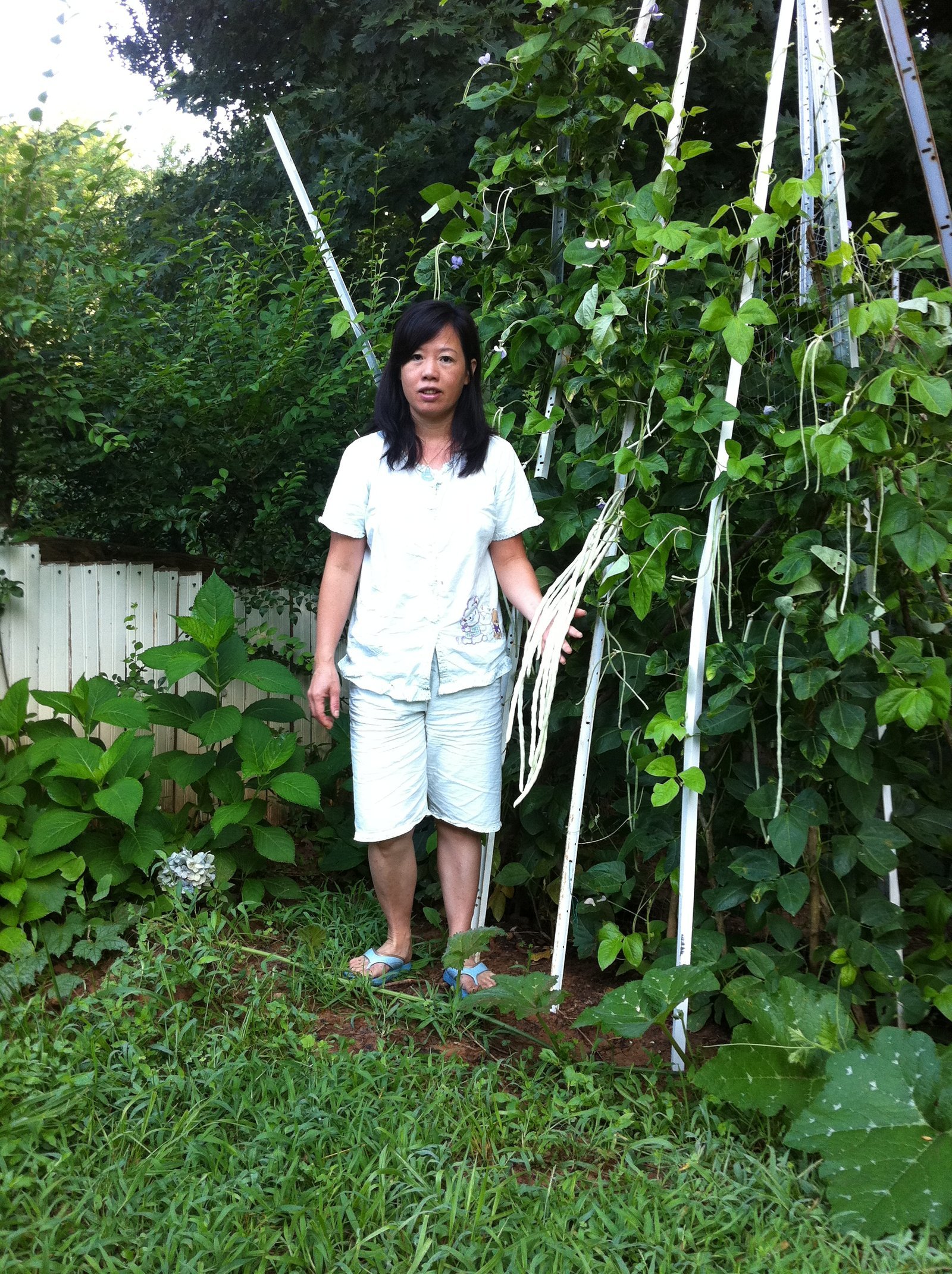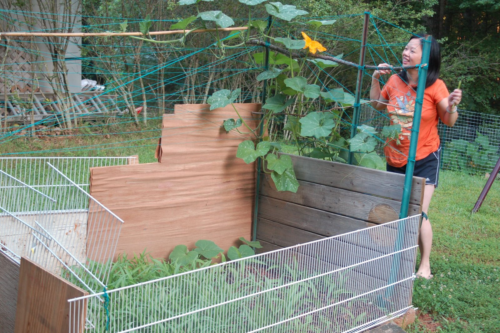 Winnie admiring a newly formed squash flower in her deer-proof garden plot. This was her first year's garden in our Virginia home.
